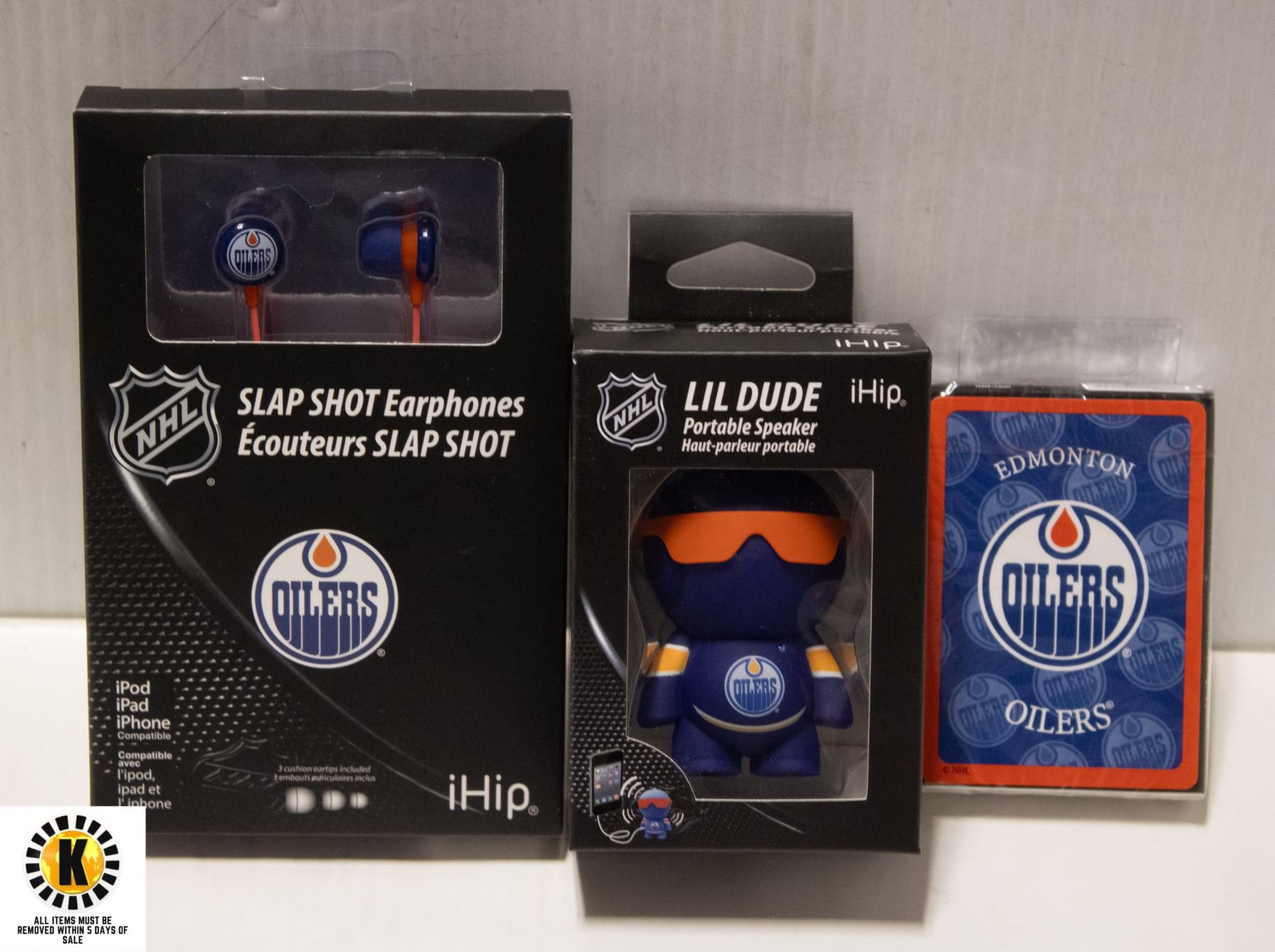 OILERS BLUE TOOTH SPEAKER , HEADPHONES, CARDS