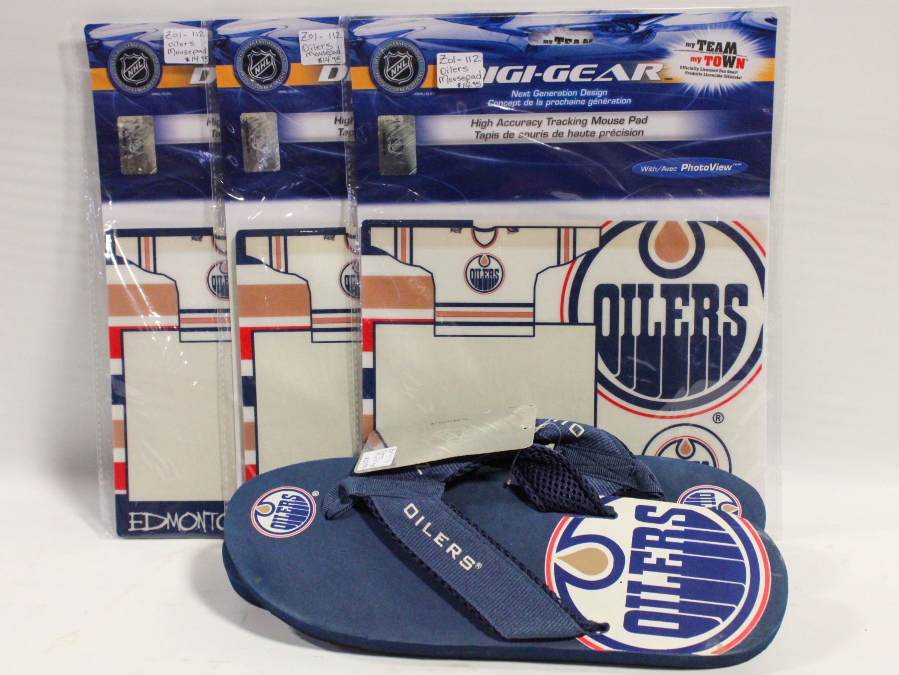 OILERS FLIP FLOPS SIZE 9/10 & 3 OILERS MOUSE PADS