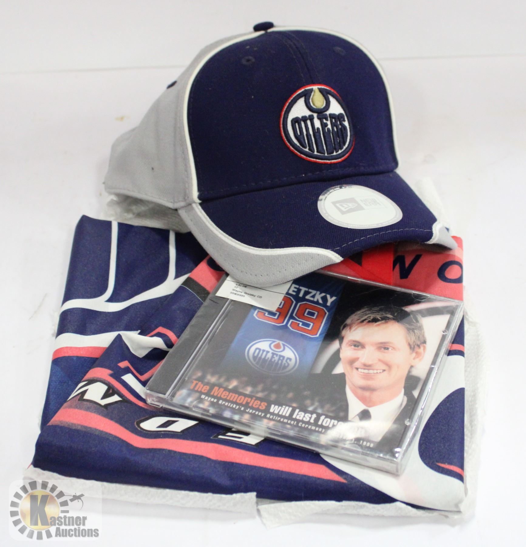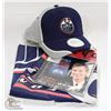 OILERS HAT, FLAG, UNOPENED GRETZKY MEMOIR C.D