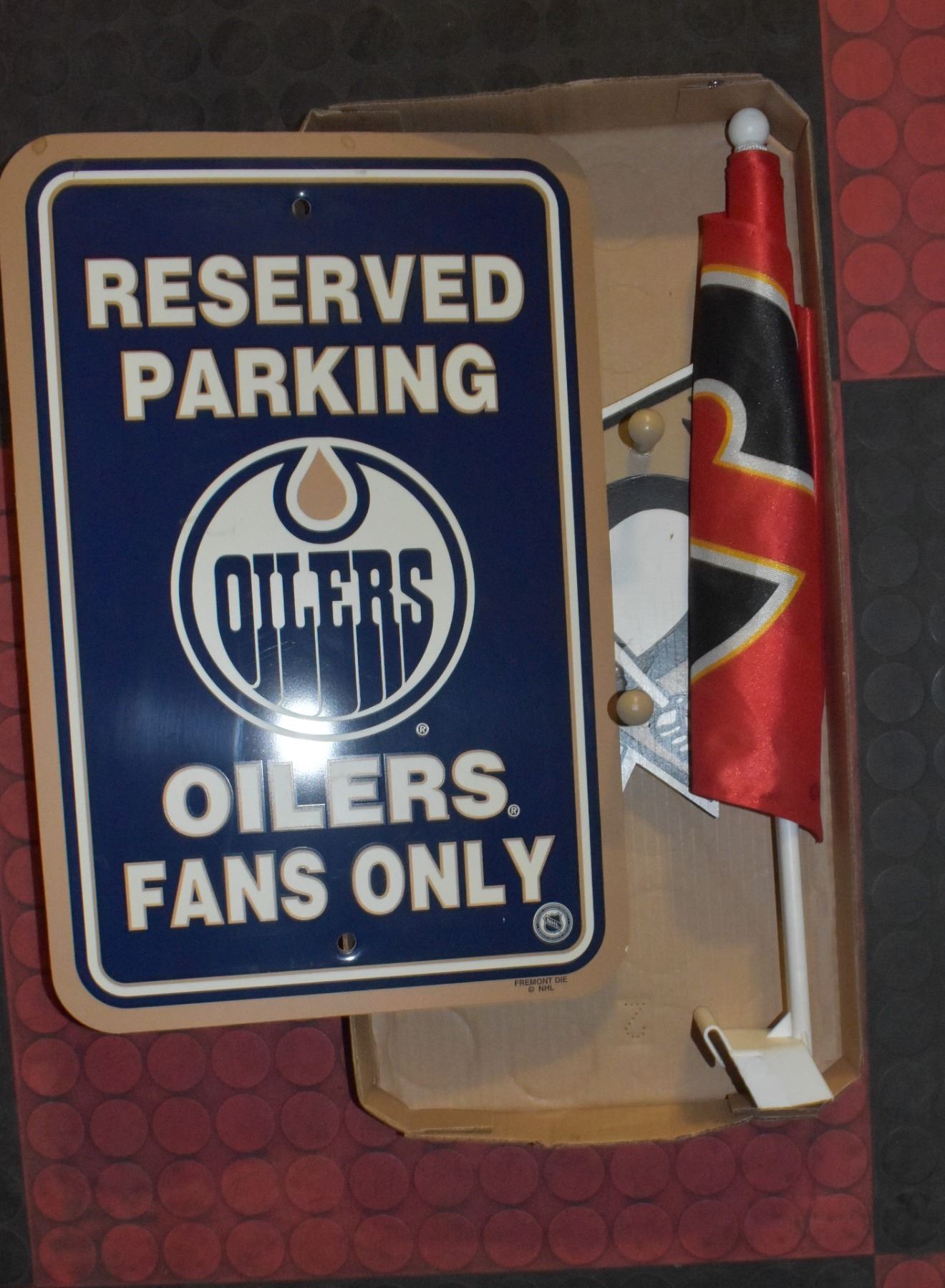 OILERS SIGN, FLAMES FLAG, PENGUINS SIGN