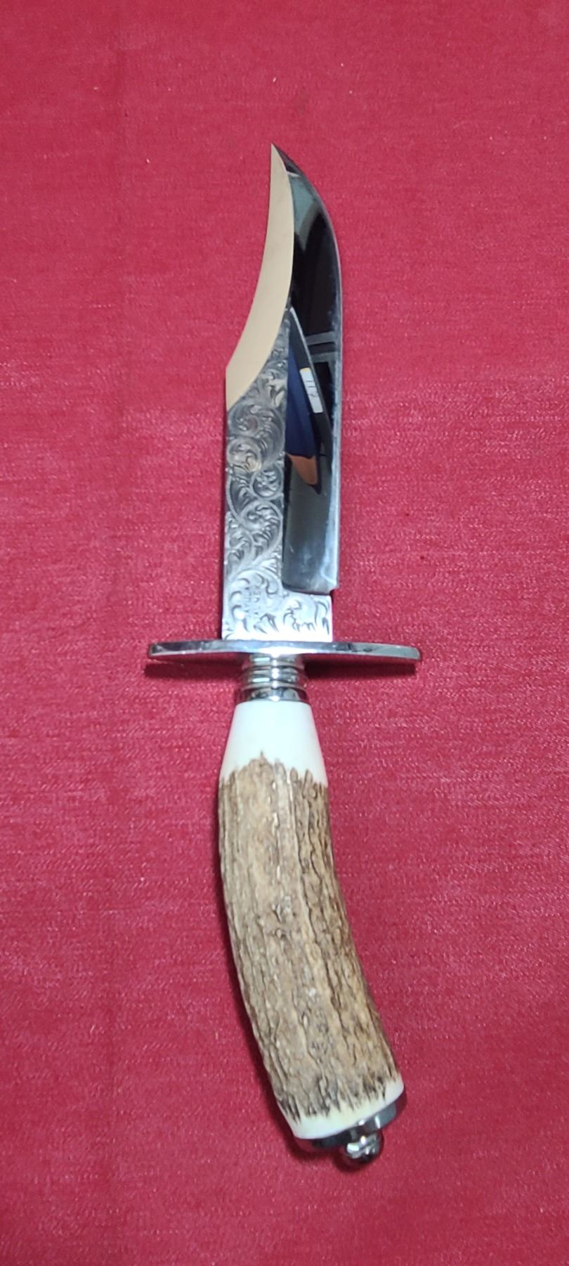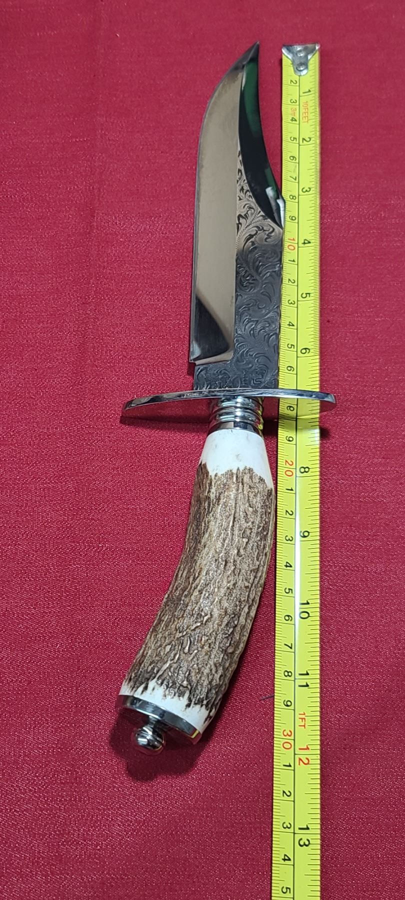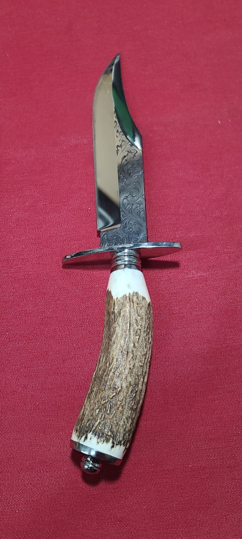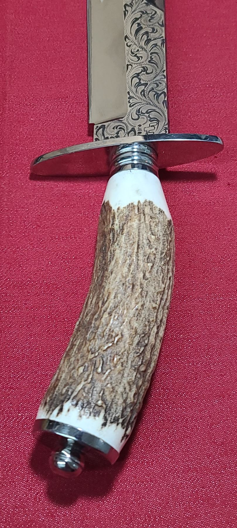 OJEDA BOWIE WITH ANTLER HANDLE AND ETCHINGS ON THE BLADE. COMES WITH SHEATH
