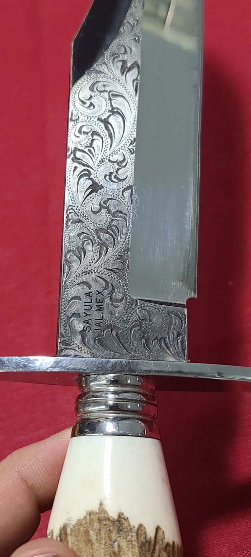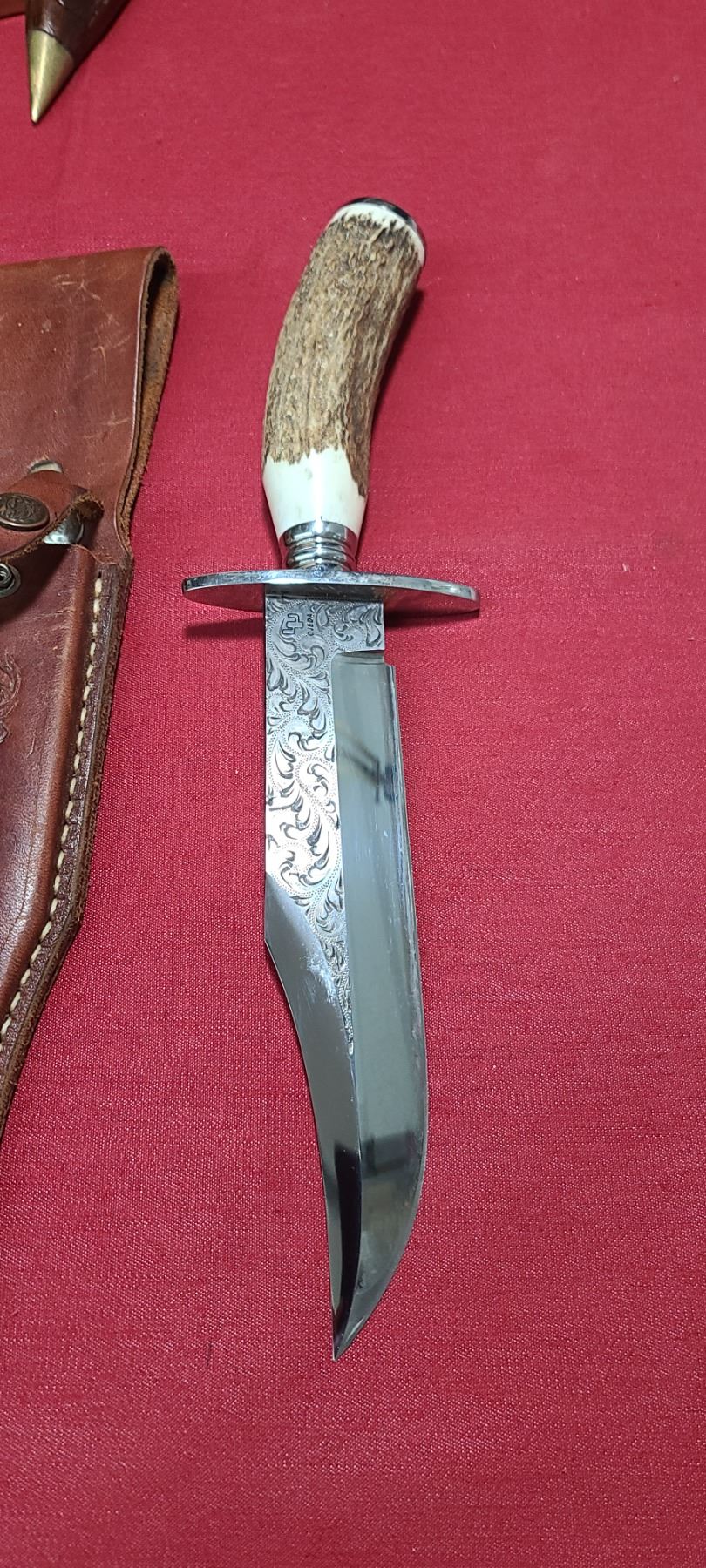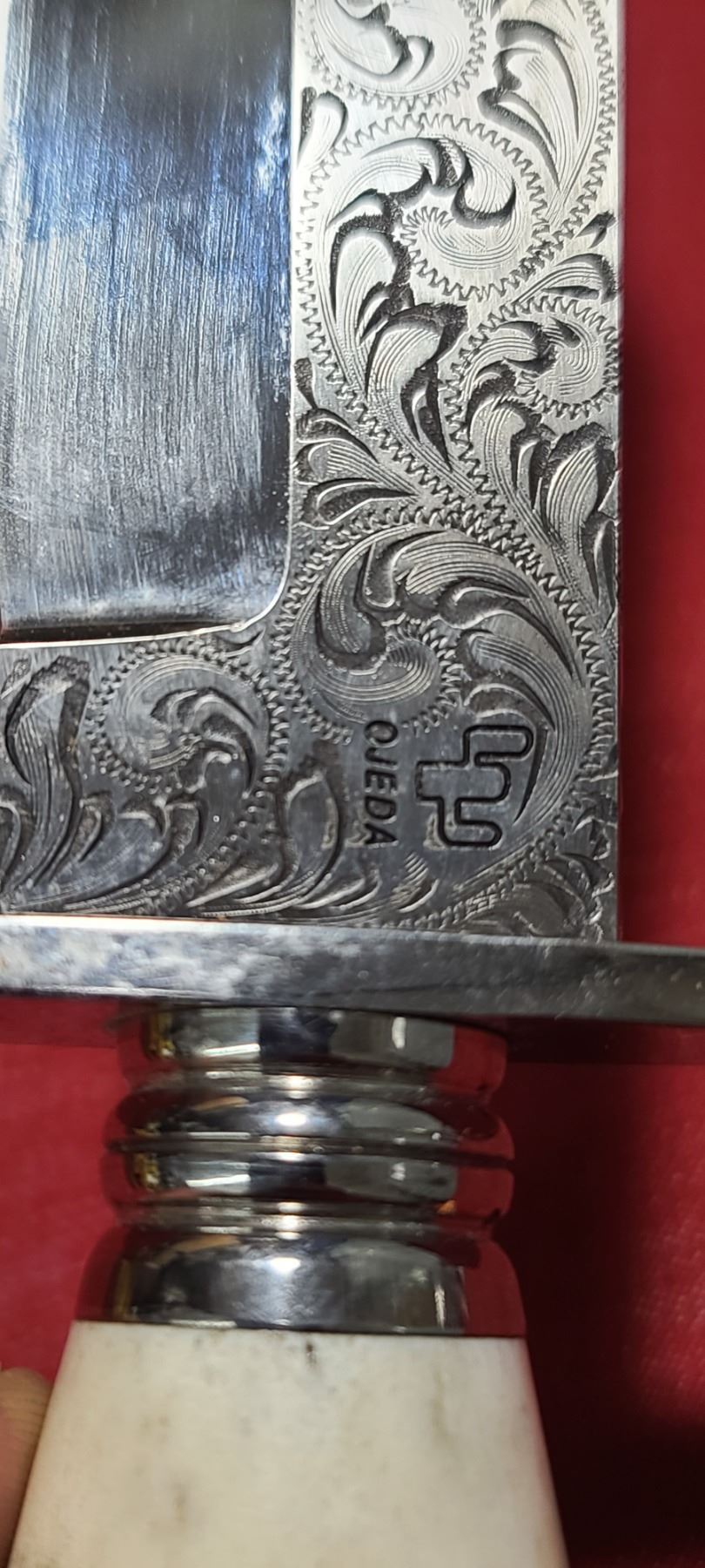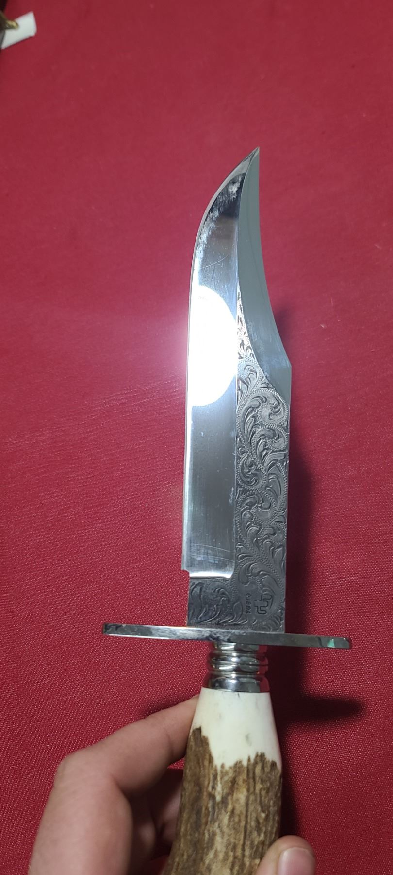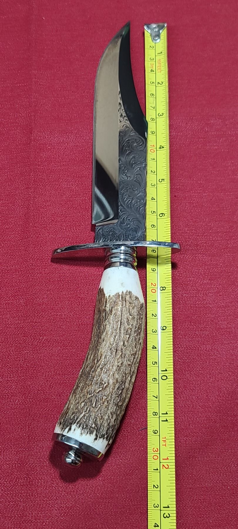 OJEDA BOWIE WITH ANTLER HANDLE AND ETCHINGS ON THE BLADE. COMES WITH SHEATH