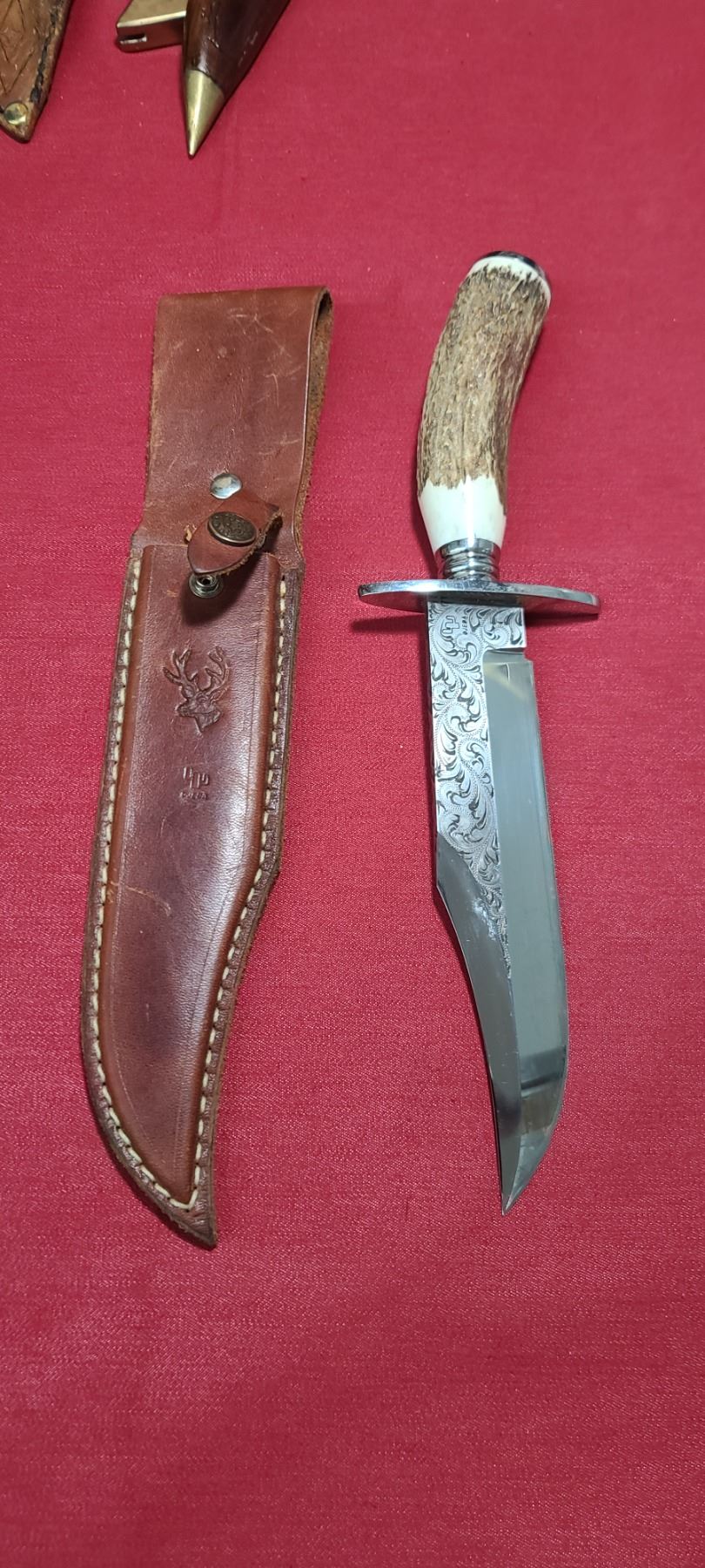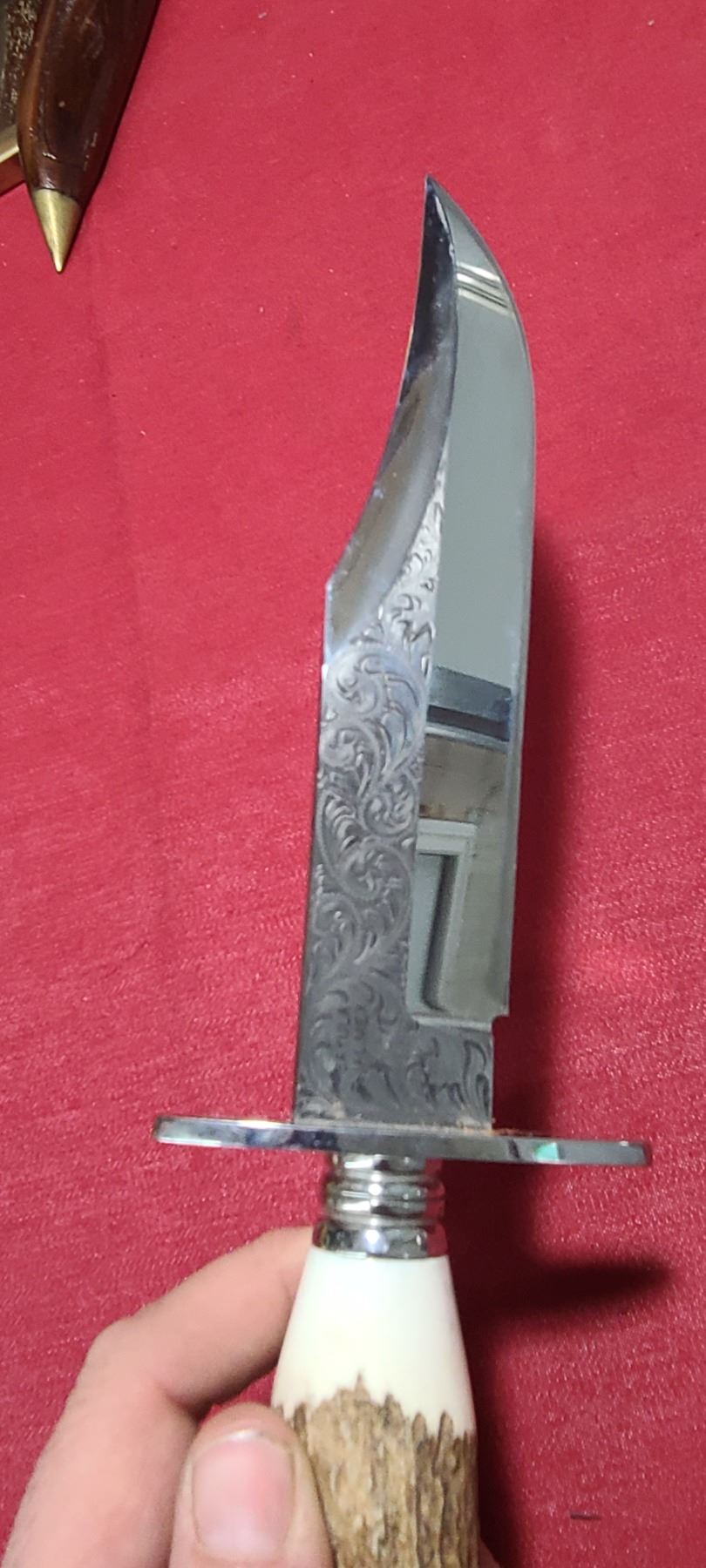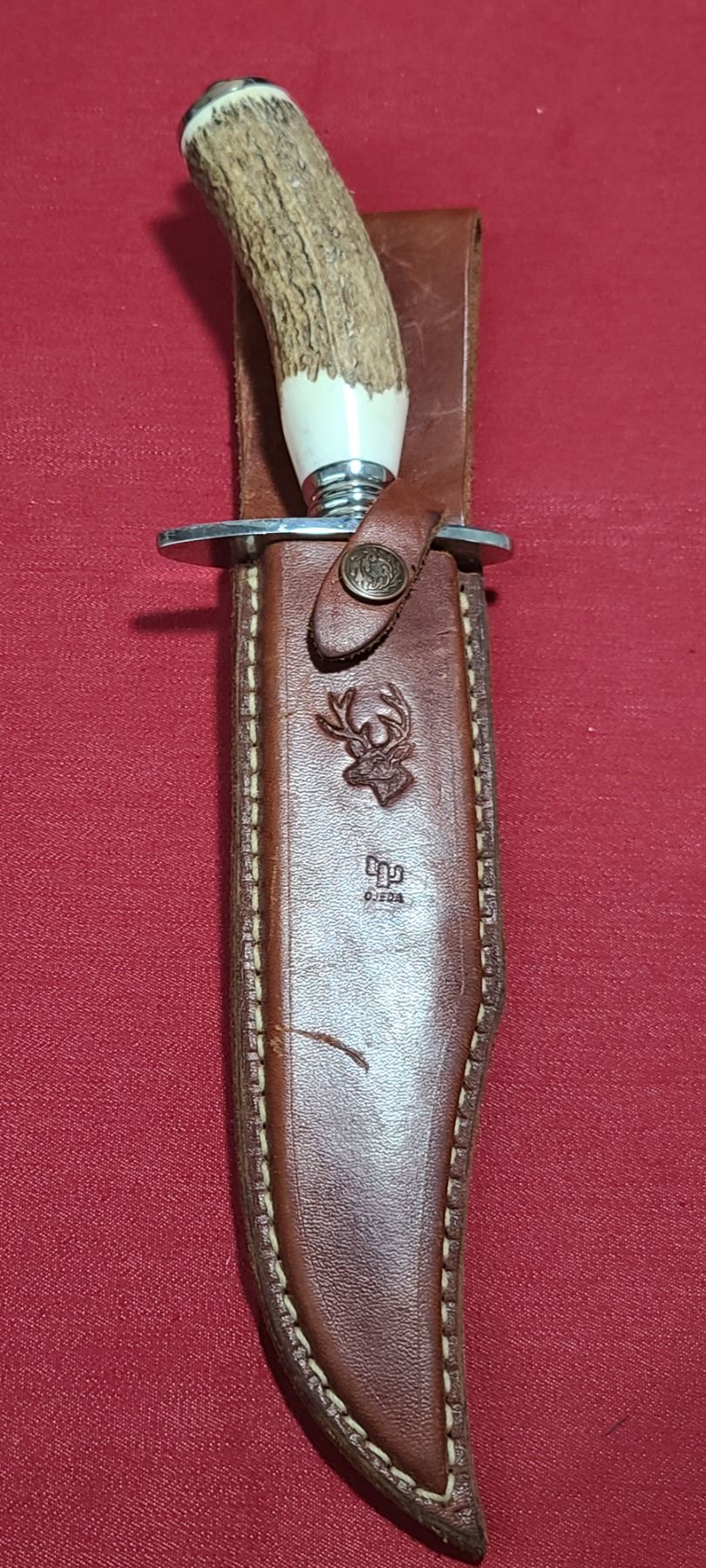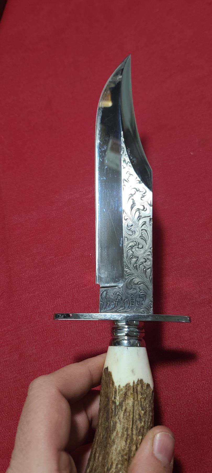 OJEDA BOWIE WITH ANTLER HANDLE AND ETCHINGS ON THE BLADE. COMES WITH SHEATH