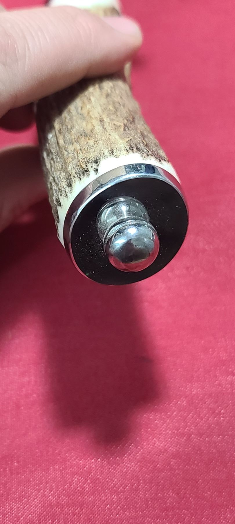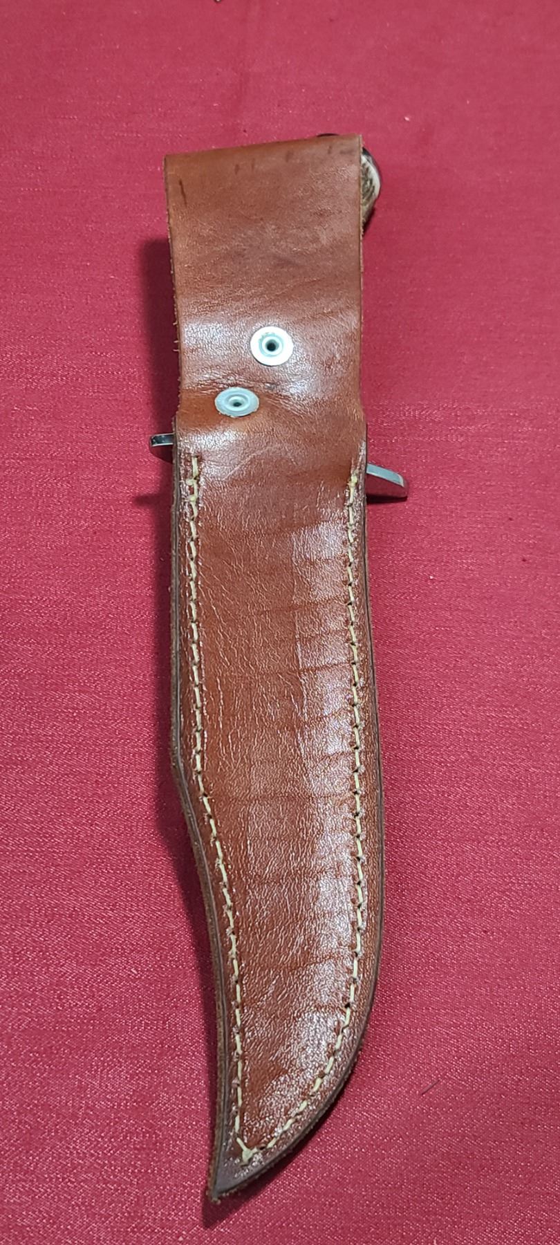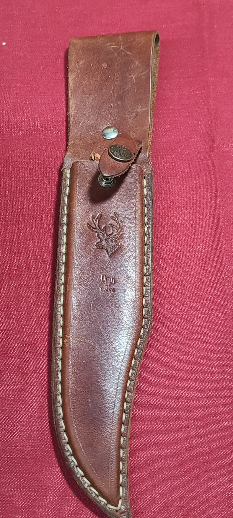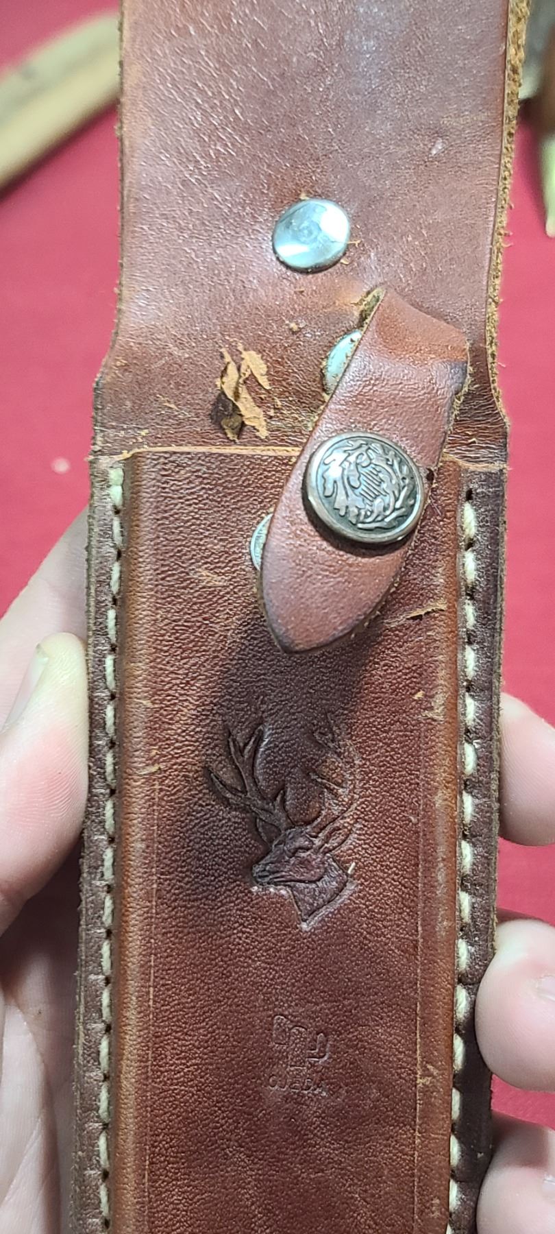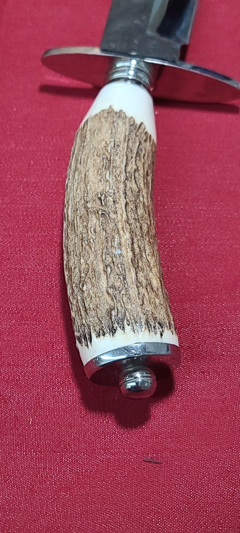 OJEDA BOWIE WITH ANTLER HANDLE AND ETCHINGS ON THE BLADE. COMES WITH SHEATH