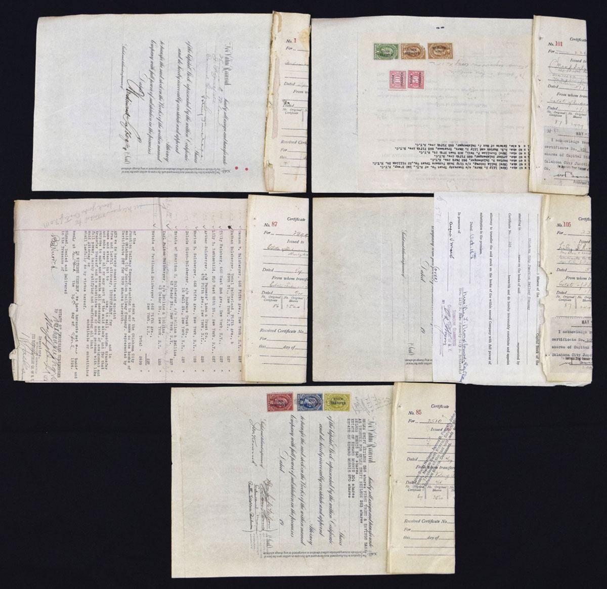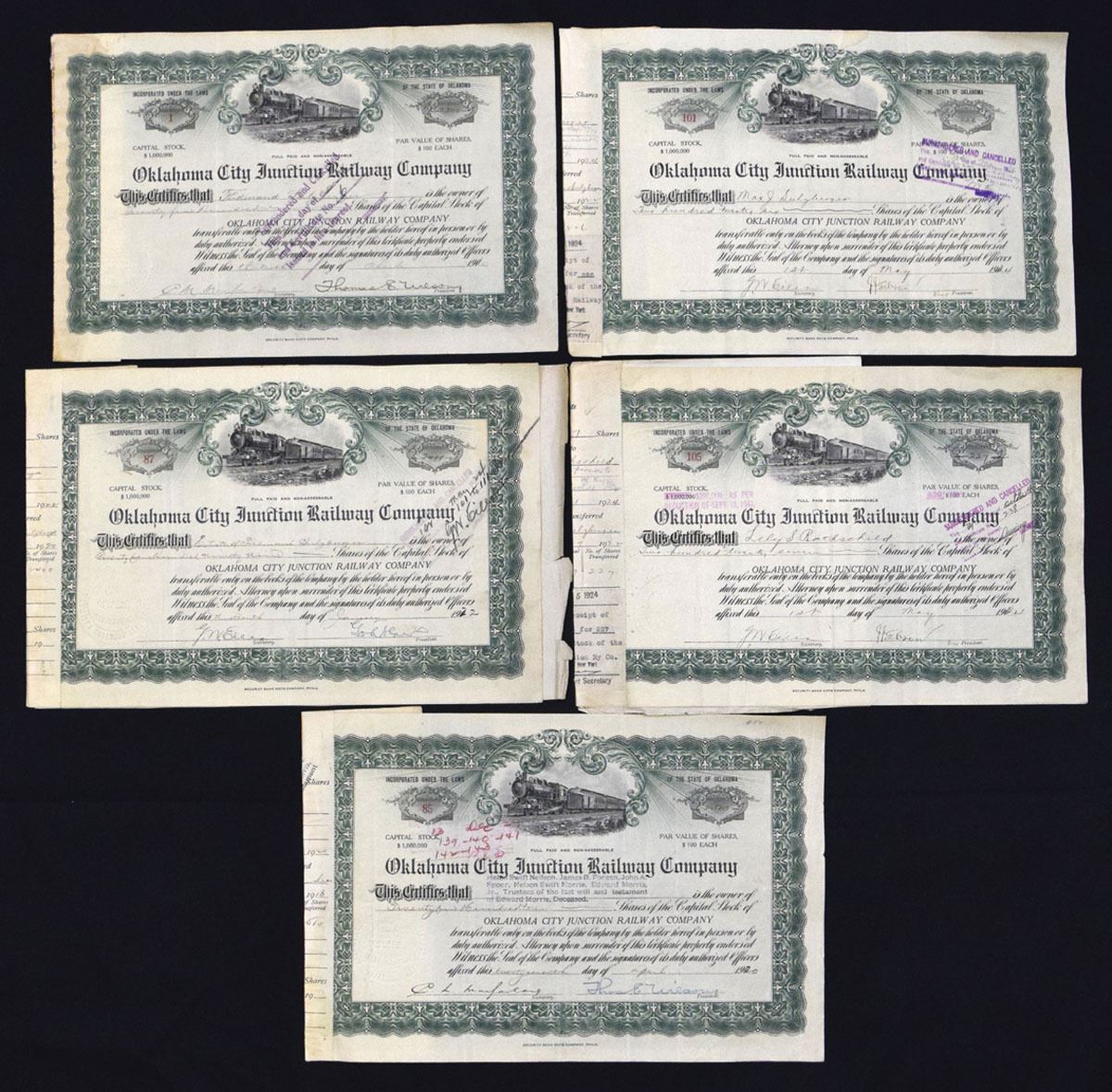 Oklahoma, 1910-24. Lot of 5 I/C Capital Stock Certificates for Varying shares, All have green border with train in frame at top center, S/Ns range from Serial #1 to 105, Certificates are in Fine to VF condition. SBNC. (5). Sold "AS IS" no returns accepted.