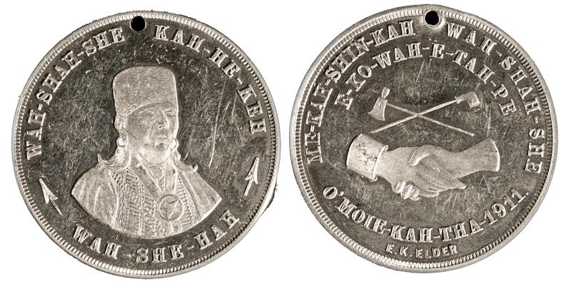 Obverse: Wah-Shah-She / Kah-He-Keh / pictorial Indian dignitary / Wah-She-Hah; Reverse: Me-Kah-Shin-Kah Wah-Shah - She / E-Ko-Wah-E- Tah - Pe/ pictorial crossed peace pipe and tomahawk above clasped hands / O'moie-kah-tha-1911 / E.K. Elder. White metal, 38mm, holed at top. Extremely fine condition.