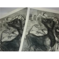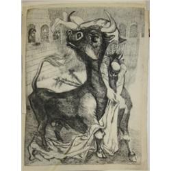 Okerbloom, Charles (3) sketches of bull and matador. Original is signed in lower right and two copies are not signed. 19" x 25" unframed.