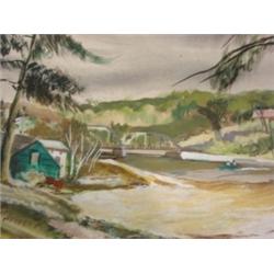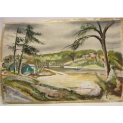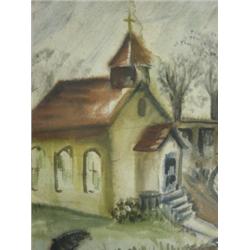 Okerbloom, Charles (attributed) double-sided painting. One side is watercolor and shows a church. The other is oil and shows a river and bridge scene. Unsigned and unframed. 21.5" x 15.5" unframed.