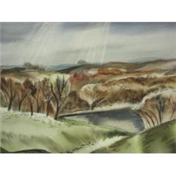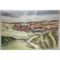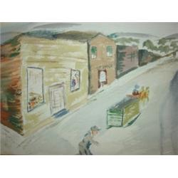 Okerbloom, Charles (attributed) double-sided watercolor painting. One side shows town scene with horse drawn cart. The other side shows valley landscape. Unsigned and unframed. 23" x 15" unframed.
