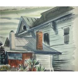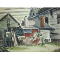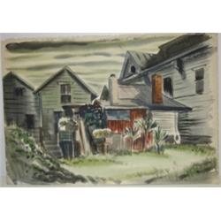 Okerbloom, Charles I. (attributed) watercolor painting of farm shacks. Unsigned and unframed. 23" x 16" unframed.