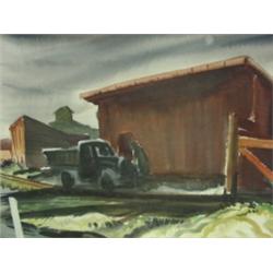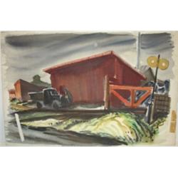 Okerbloom, Charles I. (attributed) watercolor painting of railroad crossing scene. Unsigned and unframed. 22.75" x 15.25" unframed.