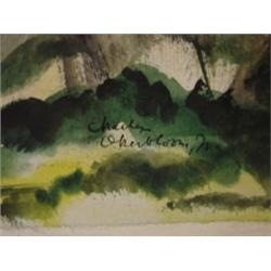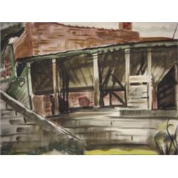 Okerbloom, Charles I. watercolor painting of primitive structure. Signed in lower right. Unframed. 21.25" x 14.75" unframed.