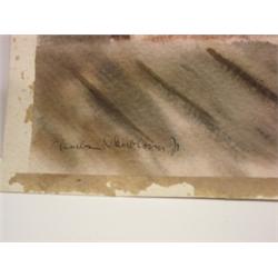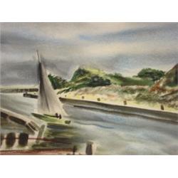Okerbloom, Charles I. watercolor painting of boat canal. Signed in lower left. Unframed. 20" x 13.5" unframed.