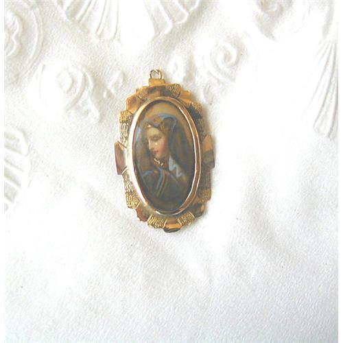 BURTON BROOK FARM ANTIQUES presents a circa 1900 or earlier 14k yellow gold medal with a Virgin Mary or perhaps a saint depicted under glass. The image is depicted with a tear drop. 1 1/8" oval with a closed gold back. This is a collectors item.