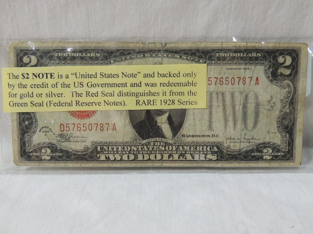 THE 2 DOLLAR NOTE IS A UNITED STATES NOTE AND BACKED ONLY BY THE CREDIT OF THE US GOVERNMENT AND WAS REDEEMABLE FOR GOLD OR SILVER. THE RED SEAL DISTINGUISHES IT FROM THE GREEN SEAL. RARE 1928 SERIES. AS SHOWN. SEE PHOTO FOR MORE DETAILS.