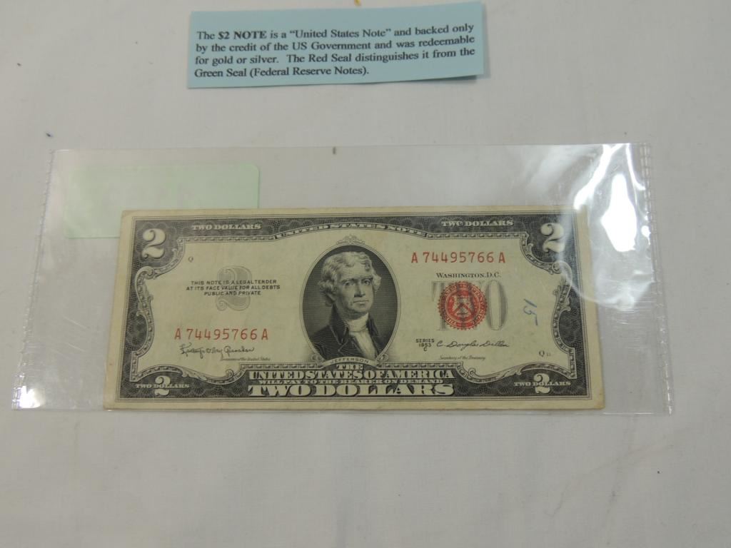 OLD $2 NOTE IS A UNITED STATES NOTE AND BACKED ONLY BY THE CREDIT OF THE UNITED STATES GOVERNMENT AND WAS REDEEMABLE FOR GOLD AND SILVER. THE RED SEAL DISTINGUISHES IT FROM THE GREEN SEAL.