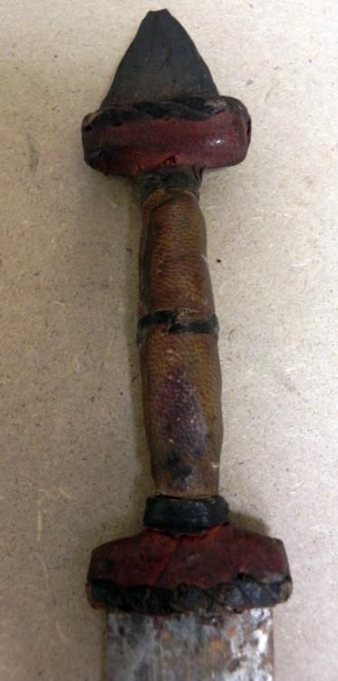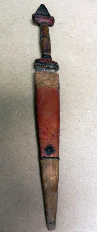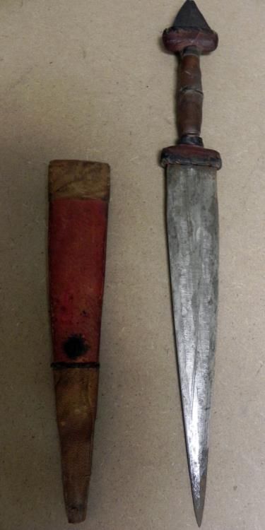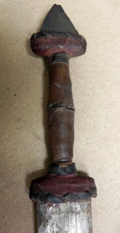 OFFERED HERE IS AN OLD AFRICAN TRIBAL DAGGER & LEATHER SHEATH. THIS IS A VERY INTERESTING DAGGER--THE GRIP & CROSSGUARDS ON TOP & BOTTOM ARE WELL CONSTRUCTED LEATHER--THERE IS A METAL TRIANGULAR SPEAR POINT PERMANENTLY ATTACHED TO THE POMMEL--7 1/4" BLADE SHOWING AGE WITH SOME RUST TOWARD TIP--THE SCABBARD IS BROWN LEATHER WITH A DESIGN PRESSED INTO THE LEATHER FRONT-- O/A LENGTH 12".