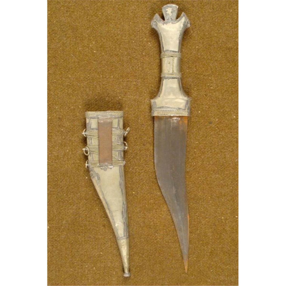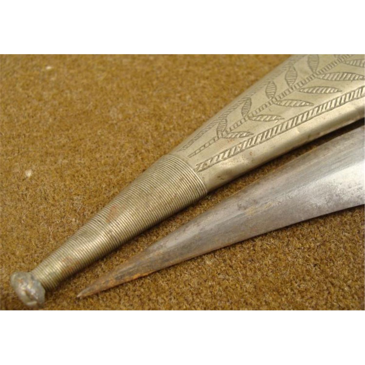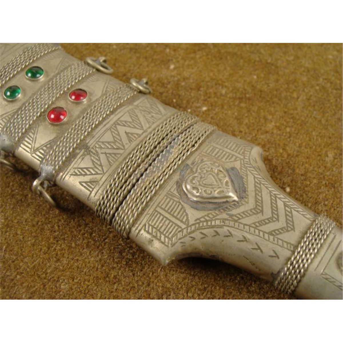 HERE IS AN OLD ARABIAN DAGGER, WITH A TOOLED SILVER HANDLE & SCABBARD, AND A CURVED BLADE. THE DAGGER IS BEAUTIFULLY HAND TOOLED AND ENGRAVED. IT HAS RED AND GREEN STONES IN THE SCABBARD & HANDLE, AND IS APPROXIMATELY 12" IN OVERALL LENGTH. *