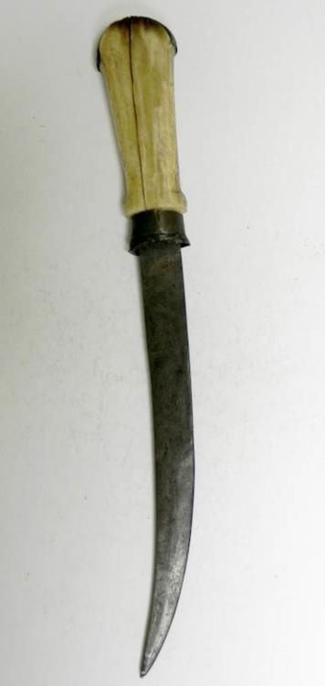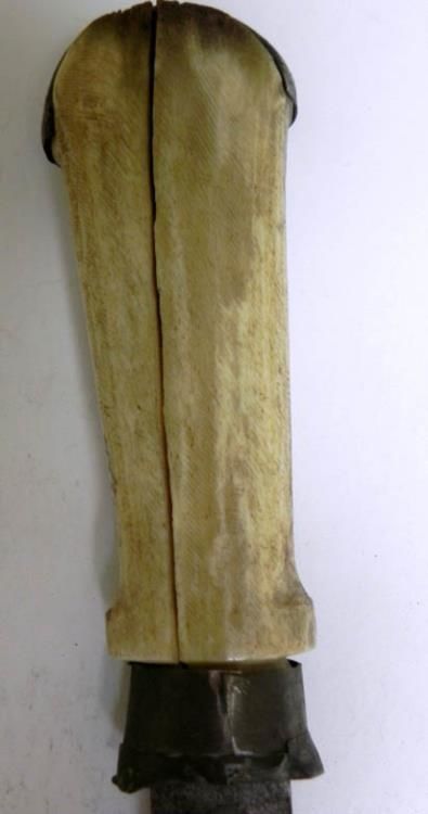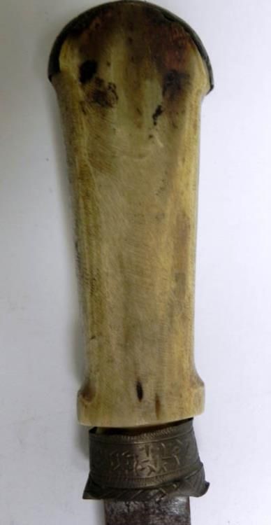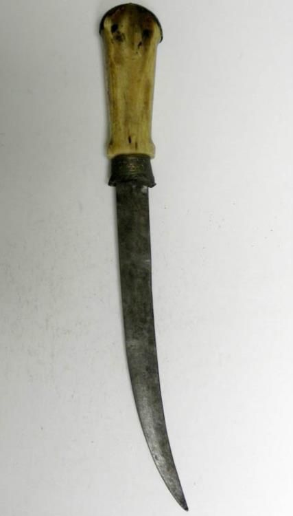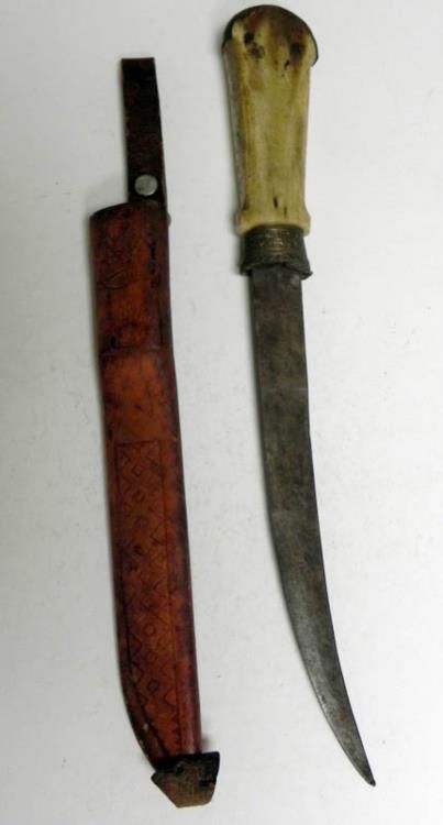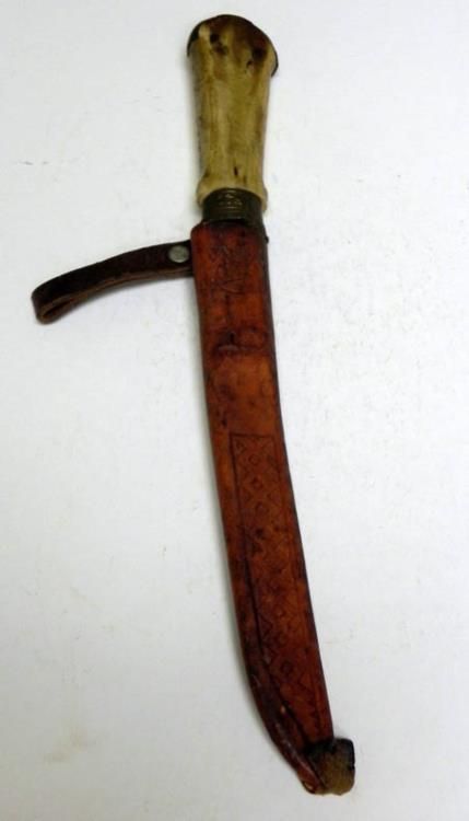THIS IS AN OLD BONE HANDLE HUNTING KNIFE-FINLAND-LEATHER SHEATH. HUGE BONE GRIP WITH METAL OVER TOP--CURVED HUNTING/SKINNING BLADE--TOOLED LEATHER SCABBARD WITH HANGING STRAP--CRACK ON ONE SIDE OF GRIP, BUT GRIP IS SOUND AND IN PLACE-