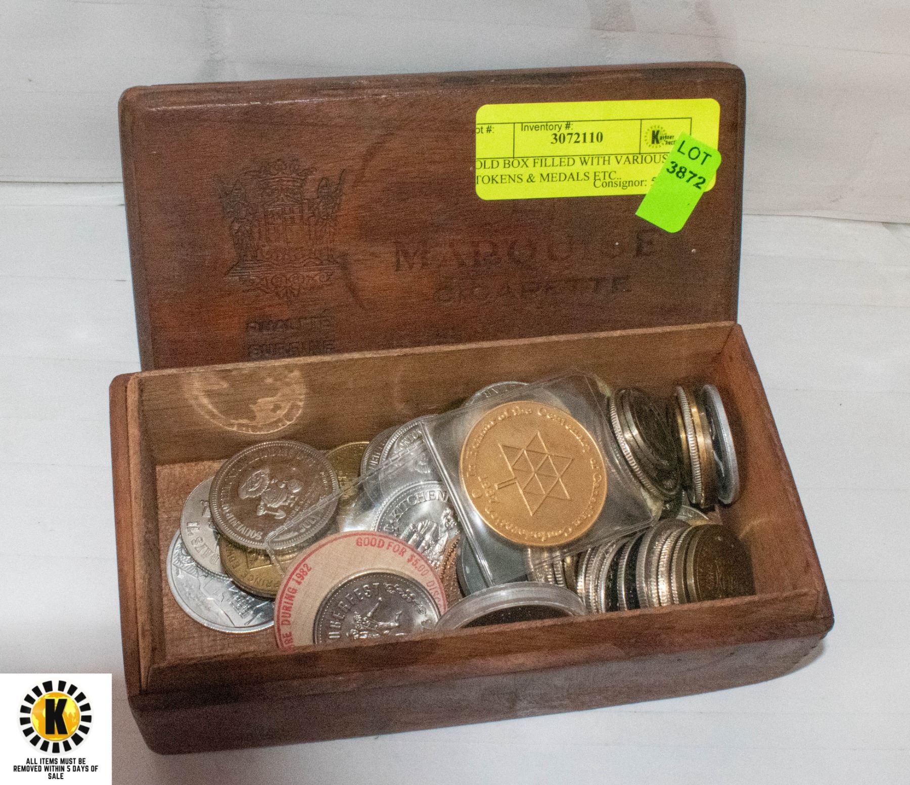 OLD BOX FILLED WITH VARIOUS TOKENS & MEDALS ETC.