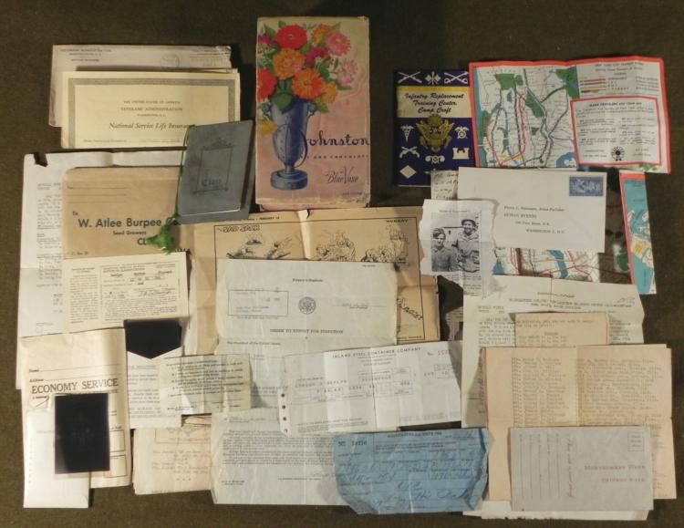 OLD BOX WITH WWII ERA MILITARY CLIPPINGS, ORDERS, PERSONAL PAPERS ETC * * *