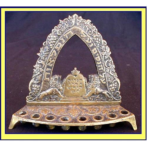 Unusual old brass Chanukiya Menorah, from the earliest days of the State of Israel.<BR>5 1/2-5 3/4 accross at widest point. 4 1/2inches high.<BR>Curved table with outstretched legs, the surface decorated with raised vines and grapeleaves within scrolls. The back is a partly open pointed arch, similarly decorated on the outside border, the inner border written in Hebrew (Al Hanissim Ve'al Haniflaot) and the lower section has carved lions holding a pair of winged tablets under a crown (with inscription Hanerot Halalu Kodesh Hem in Hebrew letters). <BR>The back has a loop for hanging and is engraved with HANDMADE IN ISRAEL and below that R.D. 539 and the Hebrew letters Mem Resh. <BR>Very good condition.