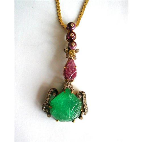 BURTON BROOK FARM ANTIQUES presents a spectacular carved emerald pendant necklace centering a large carved emerald 17.25 cts, carved ruby 2.15 carats, 3 ruby beads 2.75 cts., 38 diamonds .45 cts and one round yellow sapphire .15 cts. The pendant suspended from a modern 14k gold chain. The pendant set in 14k y gold and silver. 2 1/4" long / This is a show stopper.