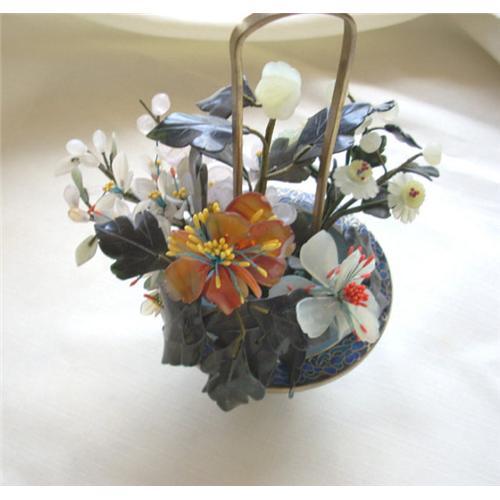 BURTON BROOK FARM ANTIQUES presents a Chinese cloisenne' basket filled with a bouquet of gem-set flowers of of carnelian, celadon agate, white agate, white jade and spinach jade leaves. The basket is 7 1/2" top of handle & the bouquet is approx. a spread 6 1/2" wide. Excellent condition and a beautiful object.