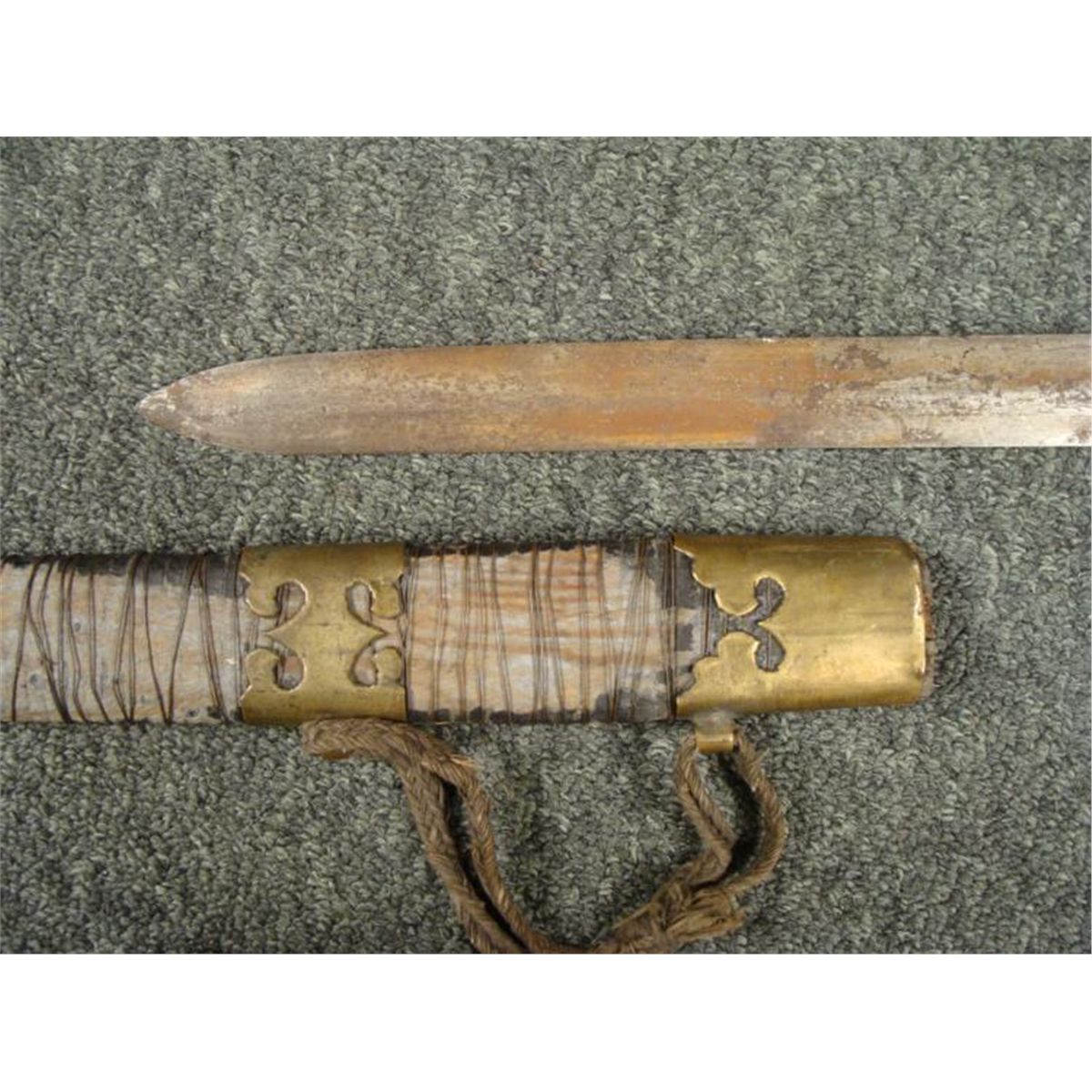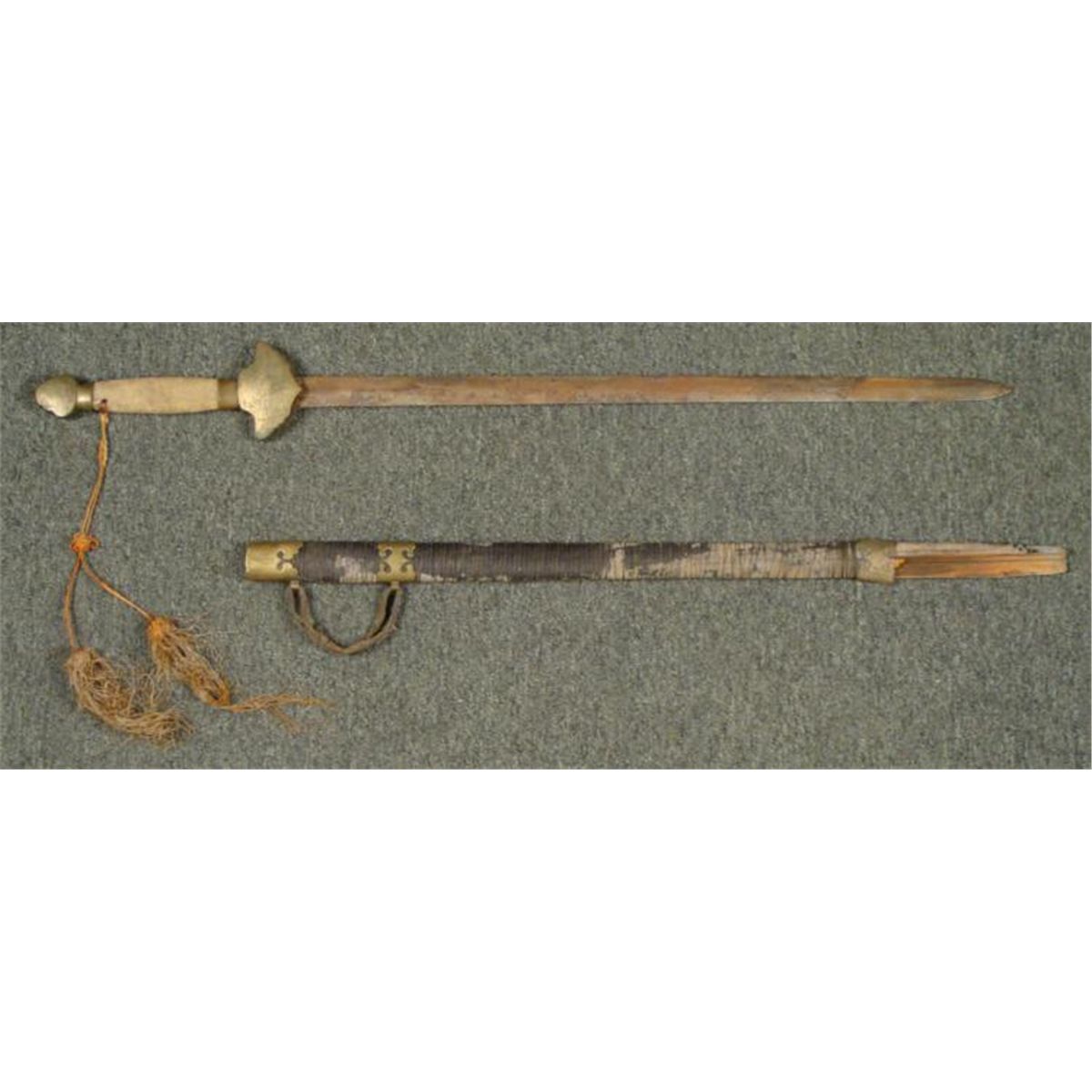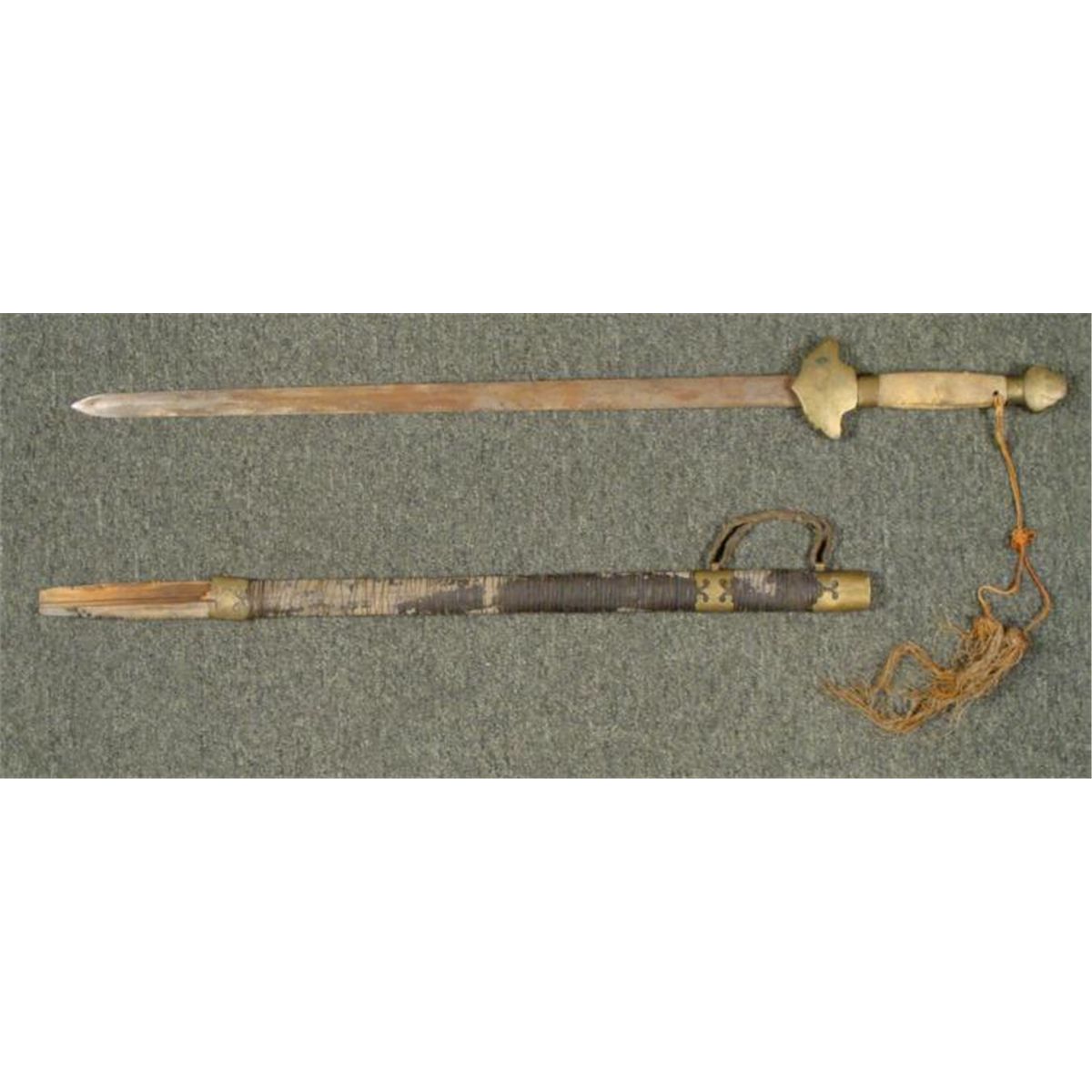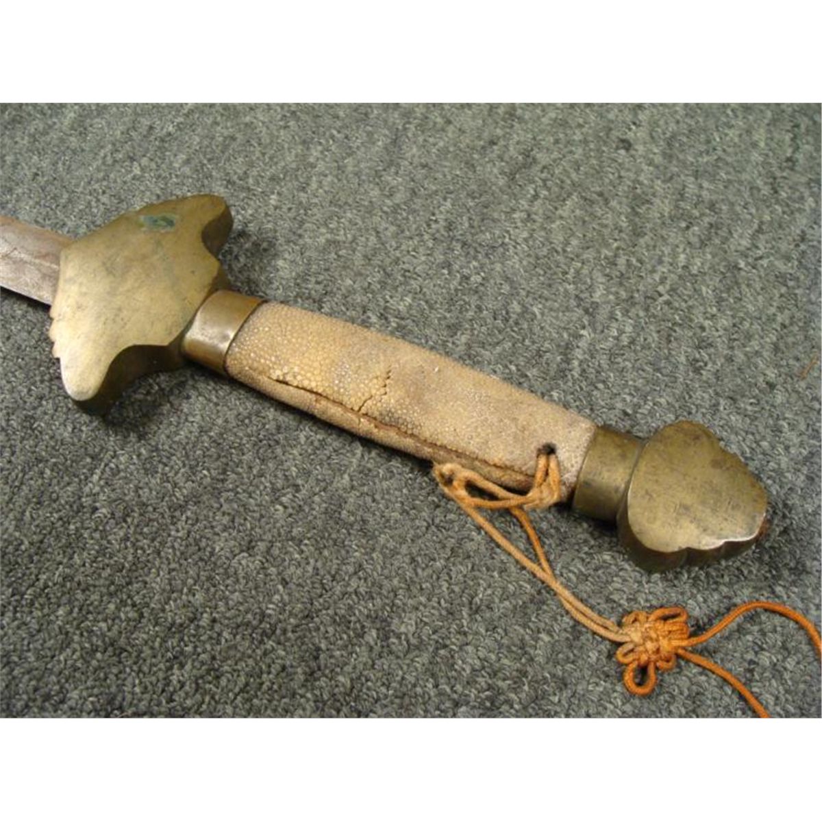 OLD CHINESE SWORD AND SCABBARD--RAYSKIN GRIP-STRAIGHT BLADE-39" O/A * HAS CONDITION PROBLEMS--OLD SWORD--PRICED ACCORDINGLY *