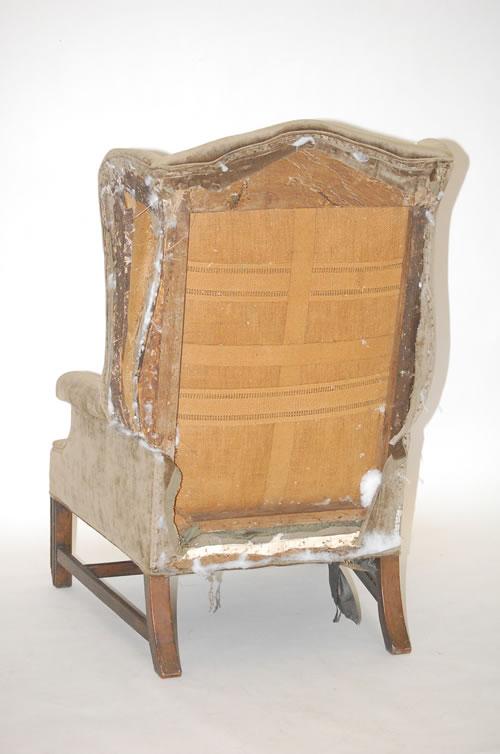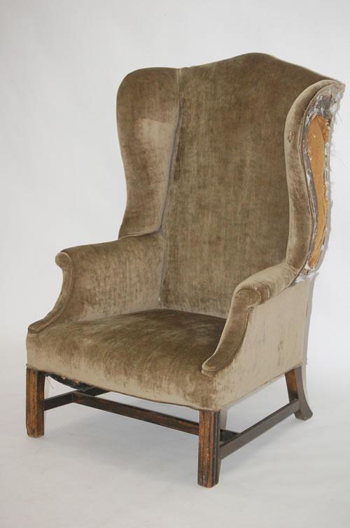 OLD CHIPPENDALE STYLE HIGH BACK WING CHAIR - MAHOGANY HIGH BACK WING CHAIR W/ MOLDED SQUARE FRONT LEGS, SABRED BACK LEGS JOINED BY STRETCHERS & BLUE VELVET UPHOLSTERY (49.5"T X 33"W X 34"D)-WEAR, SOILING,LOSSES INCL. UPHOLSTERY ON BACK, IMPERFECTIONS
