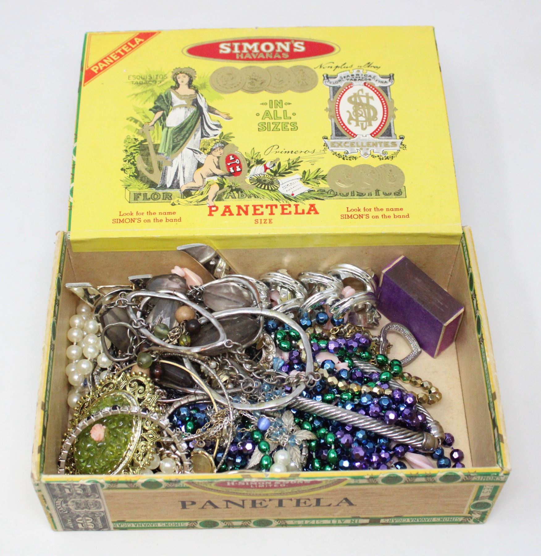 OLD CIGAR BOX FILLED WITH MISC. VINTAGE JEWELRY