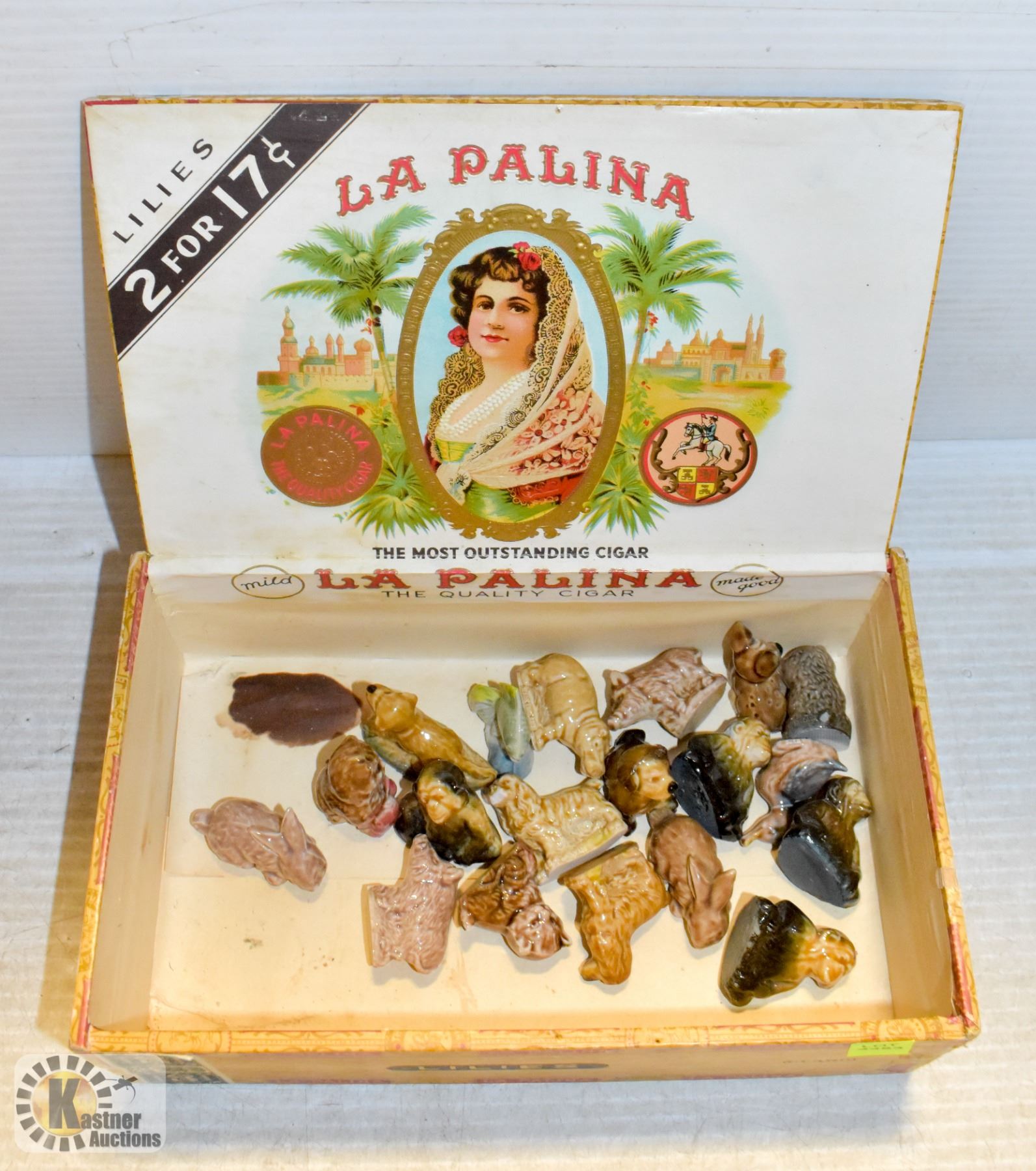 OLD CIGAR BOX WITH 19 TEA WADE FIGURES