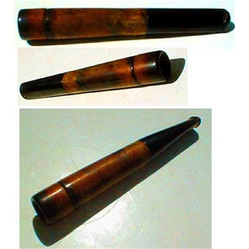 Very elegant man's cigarette holder. Probably close on 100 years old. <P><P> Measures 4" long. <P><P> Mouthpiece and first section are made of ebonised dark wood. The part that holds the cigarette is a rich golden-orange-brown, looks like fossilised walnut or some other rich substance. Marvellous patina. Good condition.