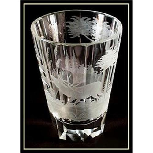 Gorgeous, panel cut hand engraved Beaker / Vase from the Art Deco era. This piece is engraved with Woodland scene and DEER as main motif. Classic LOBMEYR design, probably produced by MOSER in the 1920's. We have other pieces from this theme - stems are engraved with Wild Boar , Pheasant, Duck, Fawn and Grouse. It is extremely rare to find COMPLETE vintage set in excellent condition. We tried to take good picture, but it is very difficult to capture the beauty, which eye so easily perceives... Comparable piece is pictured in the book "Moser Artistic Glass" Edition II, page 136, plate 163, and valued $600-$800 - only bids at or above $450 will meet our reserve.