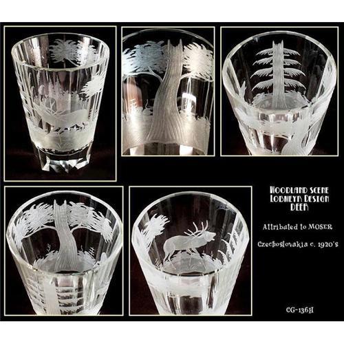 Gorgeous, panel cut hand engraved Beaker / Vase from the Art Deco era. This piece is engraved with Woodland scene and DEER as main motif. Classic LOBMEYR design, probably produced by MOSER in the 1920's. We have other pieces from this theme - stems are engraved with Wild Boar , Pheasant, Duck, Fawn and Grouse. It is extremely rare to find COMPLETE vintage set in excellent condition. We tried to take good picture, but it is very difficult to capture the beauty, which eye so easily perceives... Comparable piece is pictured in the book "Moser Artistic Glass" Edition II, page 136, plate 163, which is valued $600-$800. Please note that for Ebay Live Auctions only bids at or over $400.00 will be susscessful and meet our reserve.
