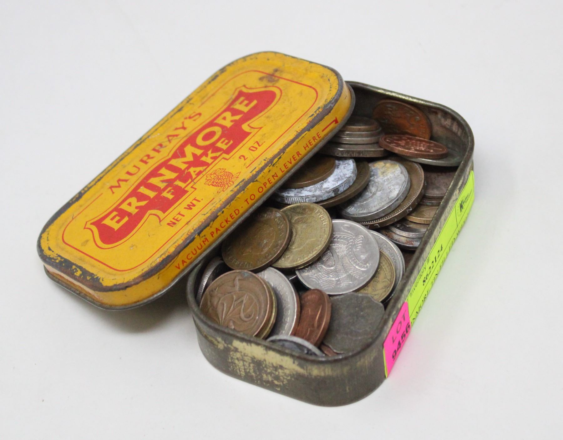 OLD ERINMORE TIN FILLED WITH MISC. OLD COINS