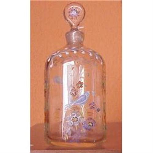 OLD EUROPEAN GLASS BOTTLE WITH COVER HAND PAINTED, FROM THE XVIII CENTURY WITH DESIGNS OF BIRDS AND FLOWERS ON THE COLOURS OF BLUE, WHITE AND ROSE, PLEASE SEE PHOTOS