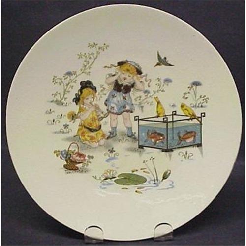 BEAUTIFUL ANTIQUE PLATE, MARKINGS ARE UNUSUAL STAMPED DOUBLE AS PER IMAGES,IT IS SARRAQUEMINES PLATE, MADE IN FRANCE AT ABOUT EARLY 1900's, LOVE THE DECORATION SHOWING ADORABLE CHILDREN, BIRDS, FISH FLOWERS etc. EXCELLENT CONDITION but for fine glaze crazing - MEASURES 8 1/2" in diam.