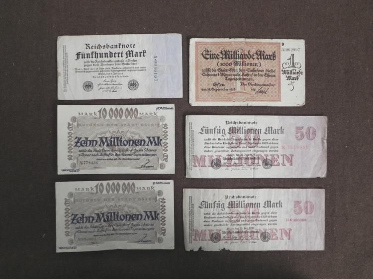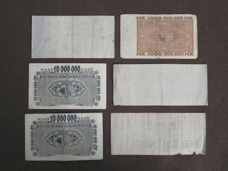 OLD GERMAN CURRENCY-2 10M NOTGELD-& OTHERS 2 NOTGELD 10 MILLION MARK---2 50 MILLION MARKS-1 I MILLION MARK & 5 HUNDRED BANK NOTE FROM 1922
