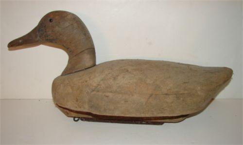 OLD HERTER BLACK DUCK DECOY. Flat bottom. Glass eyes. Shows major loss to paint and wear to body. Lead weight at bottom. 18" L