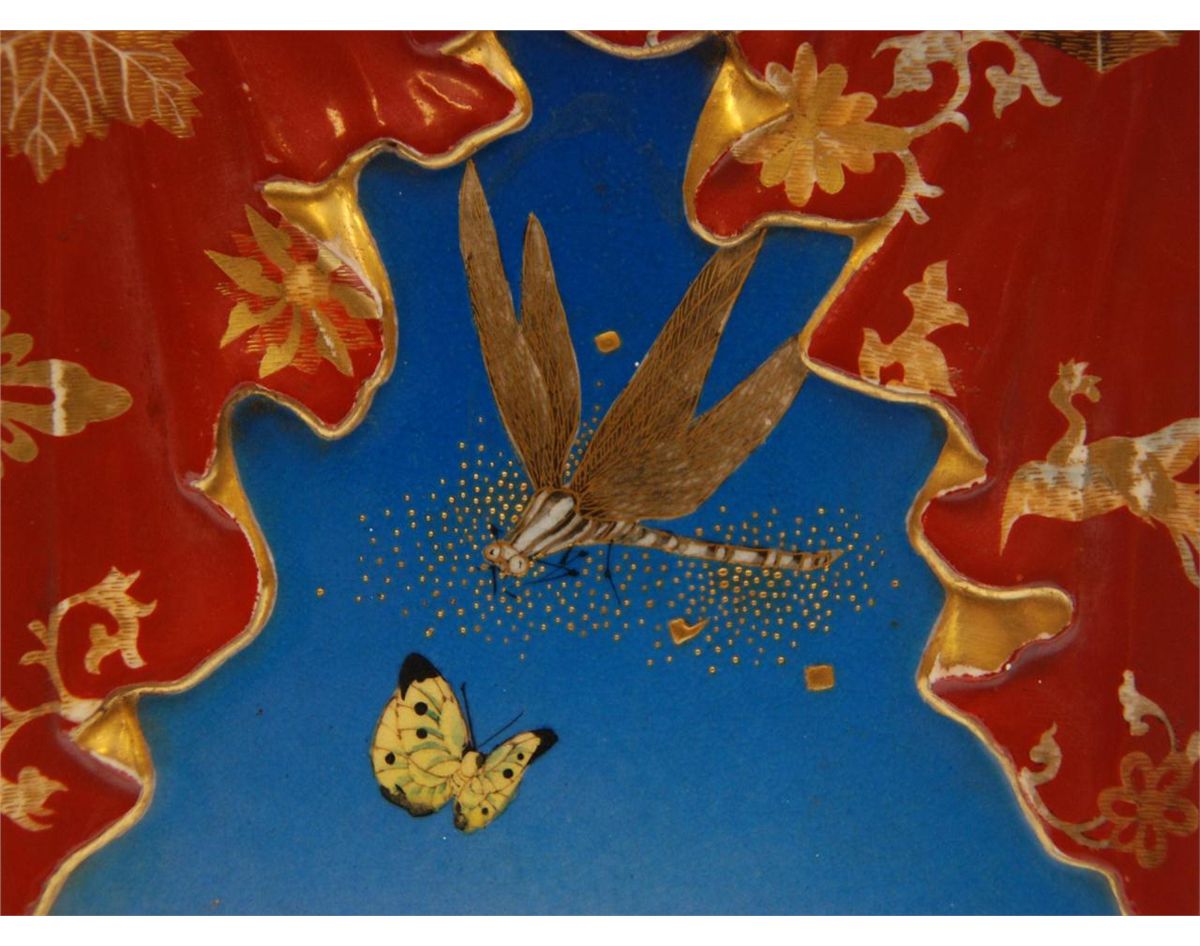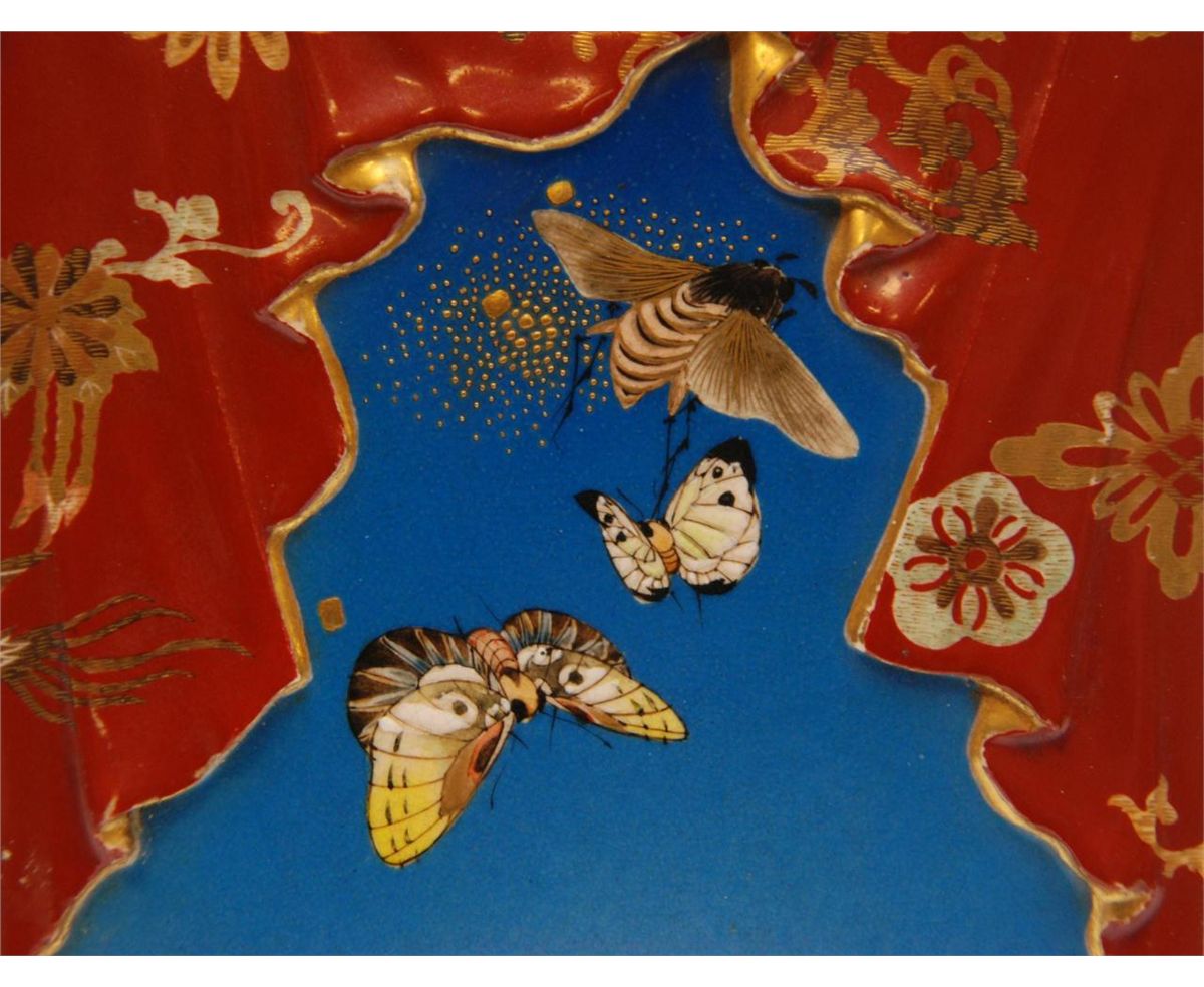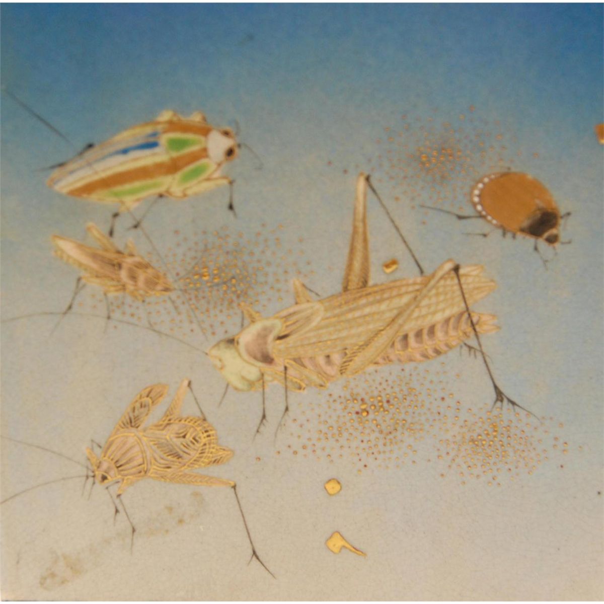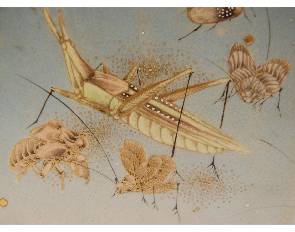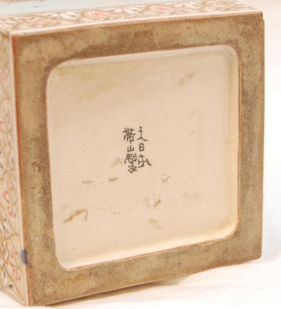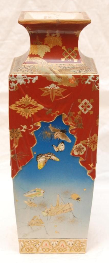Old Japanese hand painted vase depicting various insects over fading blue ground. Square form shoulders have a figural draping tapestry design with flowers and scrolled vine design. Holds black calligraphy marks to bottom. 19th/20th century. Measures 15 1/4" height x 5 1/2" width x 5 1/2" depth (38.7cm x 13.9cm x 13.9cm). Total weight of 2756 grams.