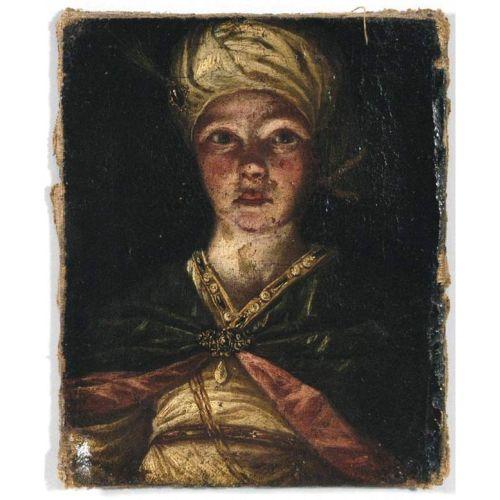 OLD MASTER OF A YOUNG TURK, possibly a fragment, 9"x8" oil on canvas, 18th century, CONDITION REPORT: chipping at edges, 2 small holes near top. PACKING AND SHIPPING: We offer packing (double boxed in most cases) and shipping of this item within the Continental United States by USPS or UPS (our choice- boxes over 30lbs or oversized may be recalculated based on buyer's location), NOT INCLUDING INSURANCE (it will be added when we know the sales price) for $20