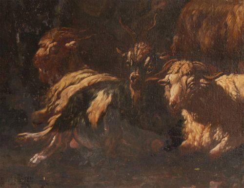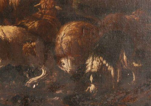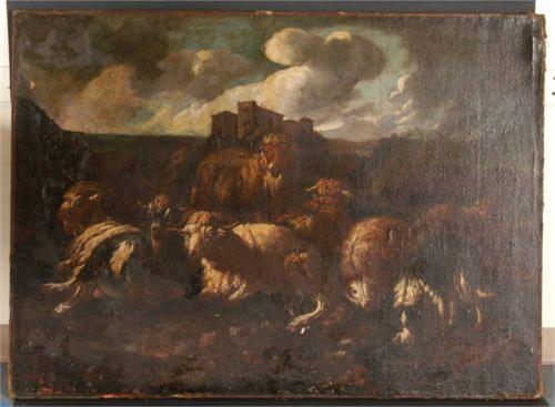 OLD MASTER PASTORAL SCENE, 39"x53" oil on canvas, 18th century, condition: various losses and old repairs including inpaint- mostly in darker areas, various flakes, some thinning in sky, chipping at edges, SHIPPING: See recommended third party shippers.