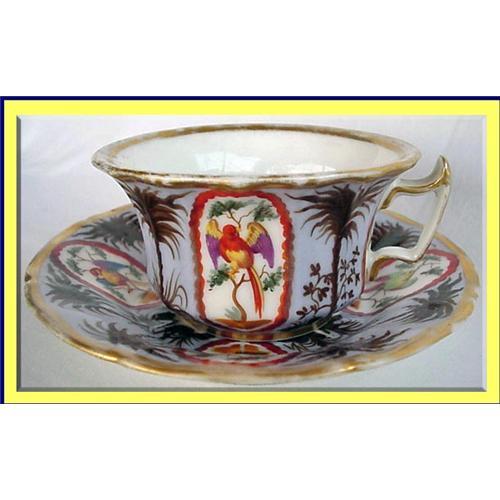 Porcelain cup and saucer made in Paris, early 19th century or before, during the height of the fascination with Oriental and Egyptian motives. <BR>Saucer is 5 5/8inches accross.Cup is 2 1/4inches high.<BR>Pale lavendar background with a pattern of handpainted Palm trees and medallions encircling brightly coloured parrots. Fabulous painting and colours. Influence of China and Japan can be seen in the small plants under the Palms, while the Palms and parrots were both considered representative of the newly discovered Egyption antiquities by the French during Napoleon's reign.<BR>Gold borders.<BR>There is some wear to the gilding, commensurate with the age, but there is no damage of any sort.