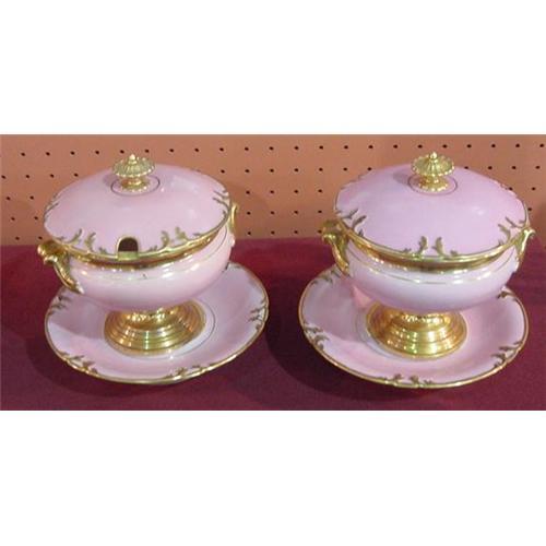 Circa 1840 French Old Paris Pair of Wonderful Sauce Tureens complete with original underplates and covers. This wonderful Pink matched pair has beautiful gilding. Excellent Condition. No Restoration. Just Beautiful. We also will be listuing a Old Paris Fruit Compote in the same colors. The tureens measure 6 1/2" in height and 6 1/2" from handle to handle. The underplates measure 7 1/2" in diameter and are 1 3/4" in height.