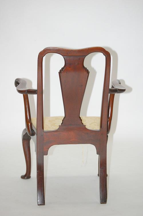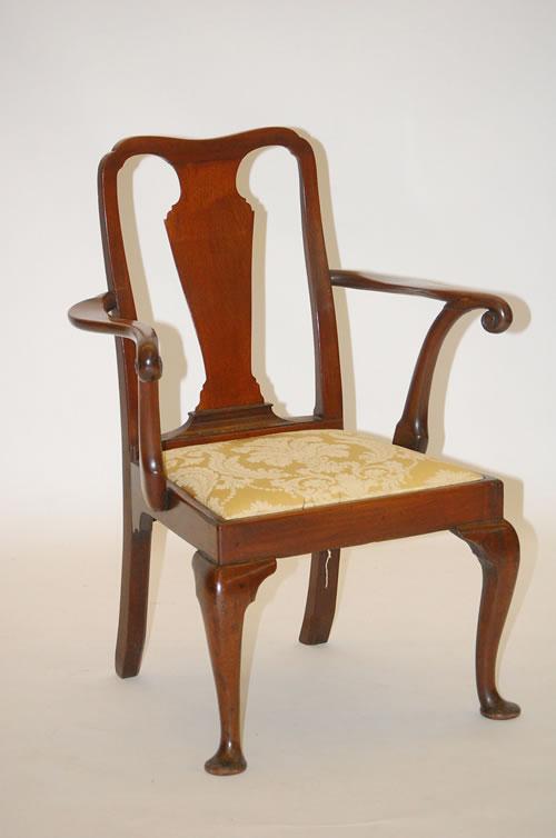 OLD QUEEN ANNE STYLE ARMCHAIR - ENGLISH MAHOGANY CHAIR W/ VASE SPLAT, YOKE CREST, SHAPED SCALLOPED ARMS & CABRIOLE LEGS W/ PAD FEET W/ GOLD UPHOLSTERED SLIP SEAT (38 1/4" T X 27 1/2" W X 24" D) - WEAR, REPAIRS, REPLACEMENTS, IMPERFECTIONS