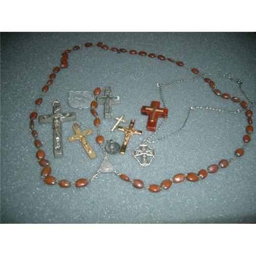VERY NICE OLD ROSARY MADE OF TINY WOODEN BEADS ,as per images, EXCELLENT CONDITION, Measures 19" long-doubled, and other six crosses gp,wood