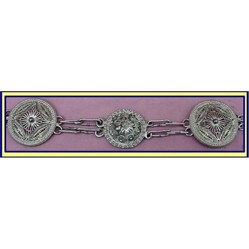 Very fine Russian sterling silver, hallmarked necklace.<BR>Continuous loop measures 13inches long (doubled) and weighs 3oz.<BR>Wonderful filigree disks with raised jewels, seperated by elongated loops. One disk has slight ding, quite negligible, while all the rest are in mint condition. Russian silver hallmarks (Slightly above sterling quality).