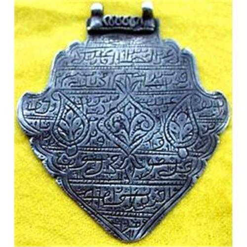 Here is a very old silver amulet, probably originating in the 19th century. Near East - very likely Persian. <P><P> Measures 2 3/8" wide & almost 3" long. <P><P> The amulet especially made by a holy person in order to protect the wearer. It has two rings at the top to be hung from. The surface is decorated with inscribed writings and other decorative elements. The back is plain, but someone has scratched the Hebrew letters aleph and bet on it. <P><P> Condition: very good although the edges are of course somewhat worn/softened with use and age.