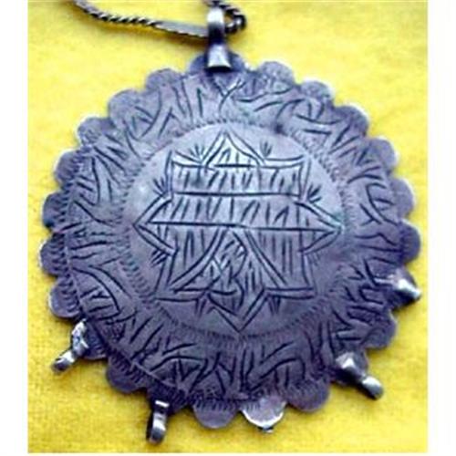 Here is an unusual old silver amulet from the Near East. Probably 19th Century. <P><P> The round shape measures 1 3/4" accross and with the rings on top and bottom 2" long. <P><P> The round shape has a scalloped edge. It is also supplied with one large loop on top for hanging and a few at the bottom - presumably to hang charms from. Instead of being inscribed with holy / magical writings, this amulet has symbolic inscriptions on it - perhaps something personal to the person who made it. <P><P> Good condition with wear appropriate to age and use.